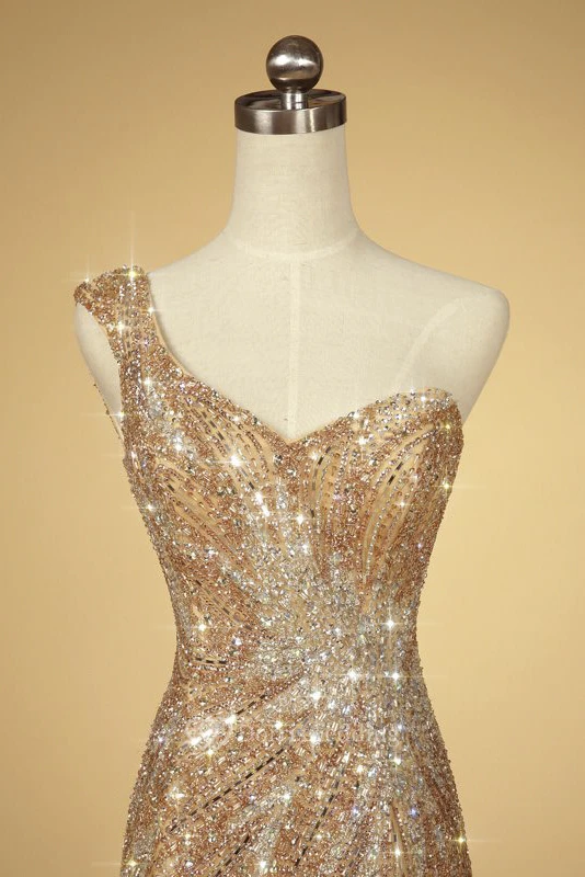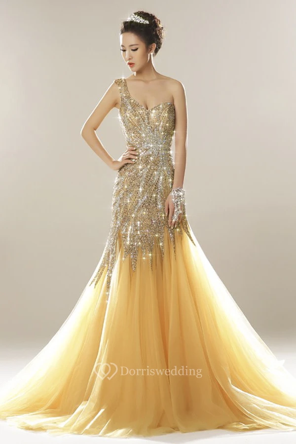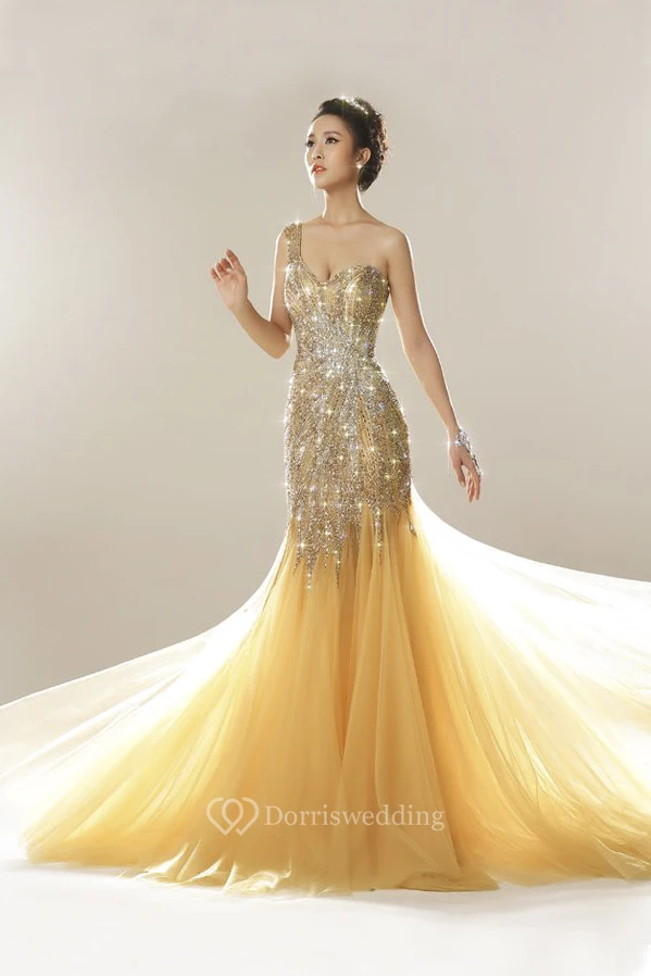 One Shoulder Beaded Open Back Luxury Tulle Mermaid Dress With Appliques