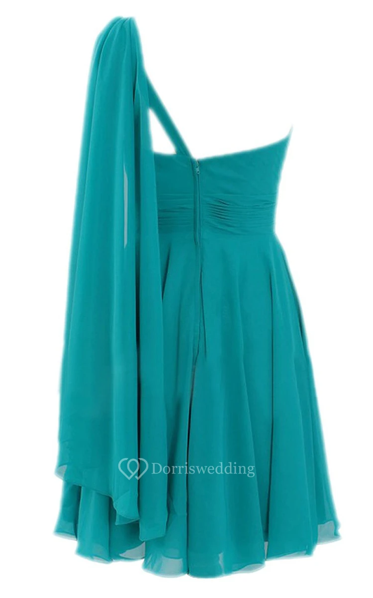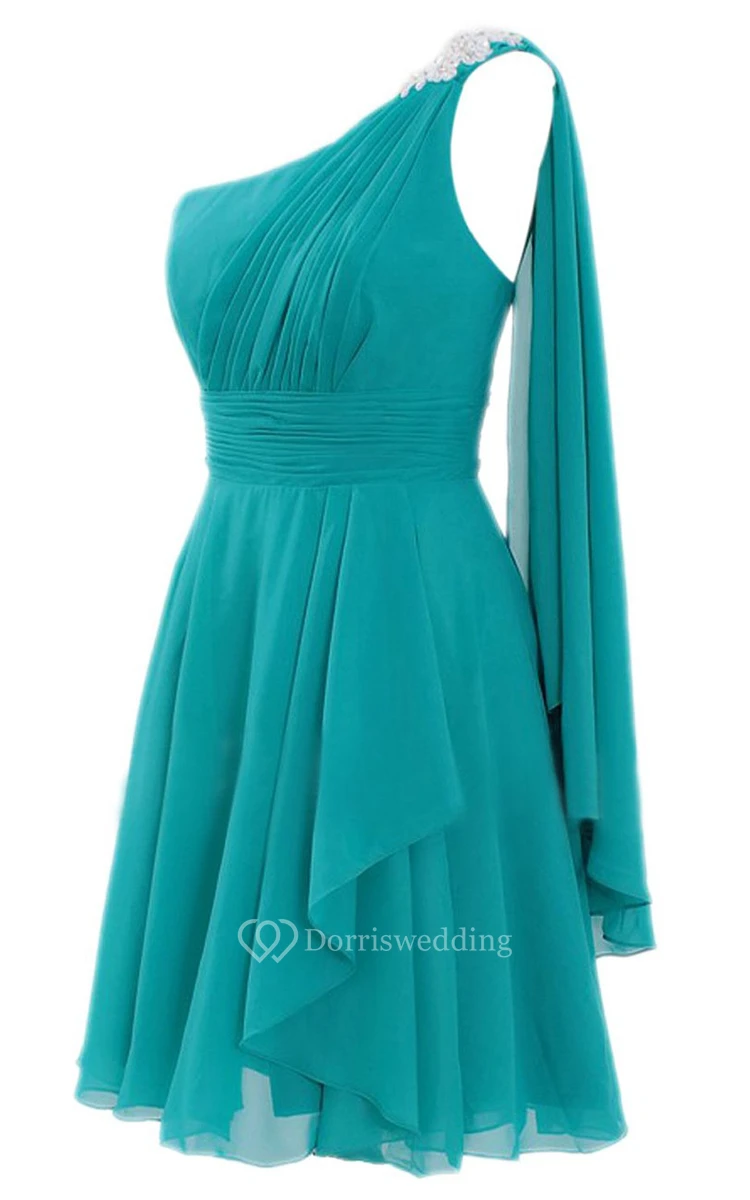 One-shoulder Beaded Pleated Chiffon A-line Gown With Cape
