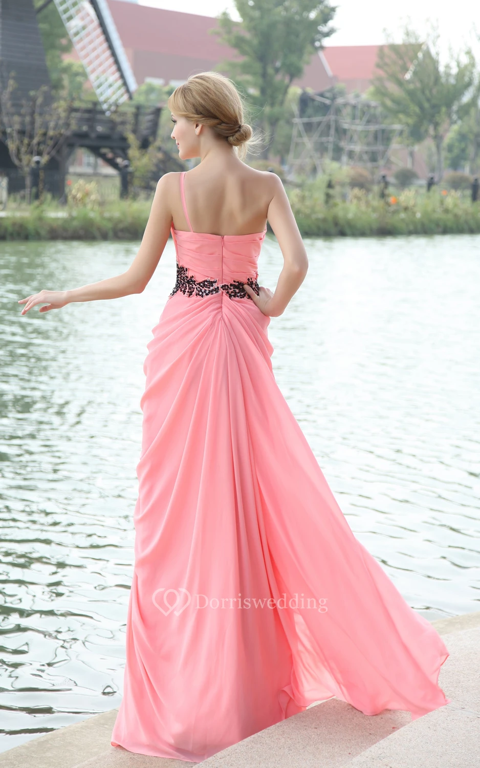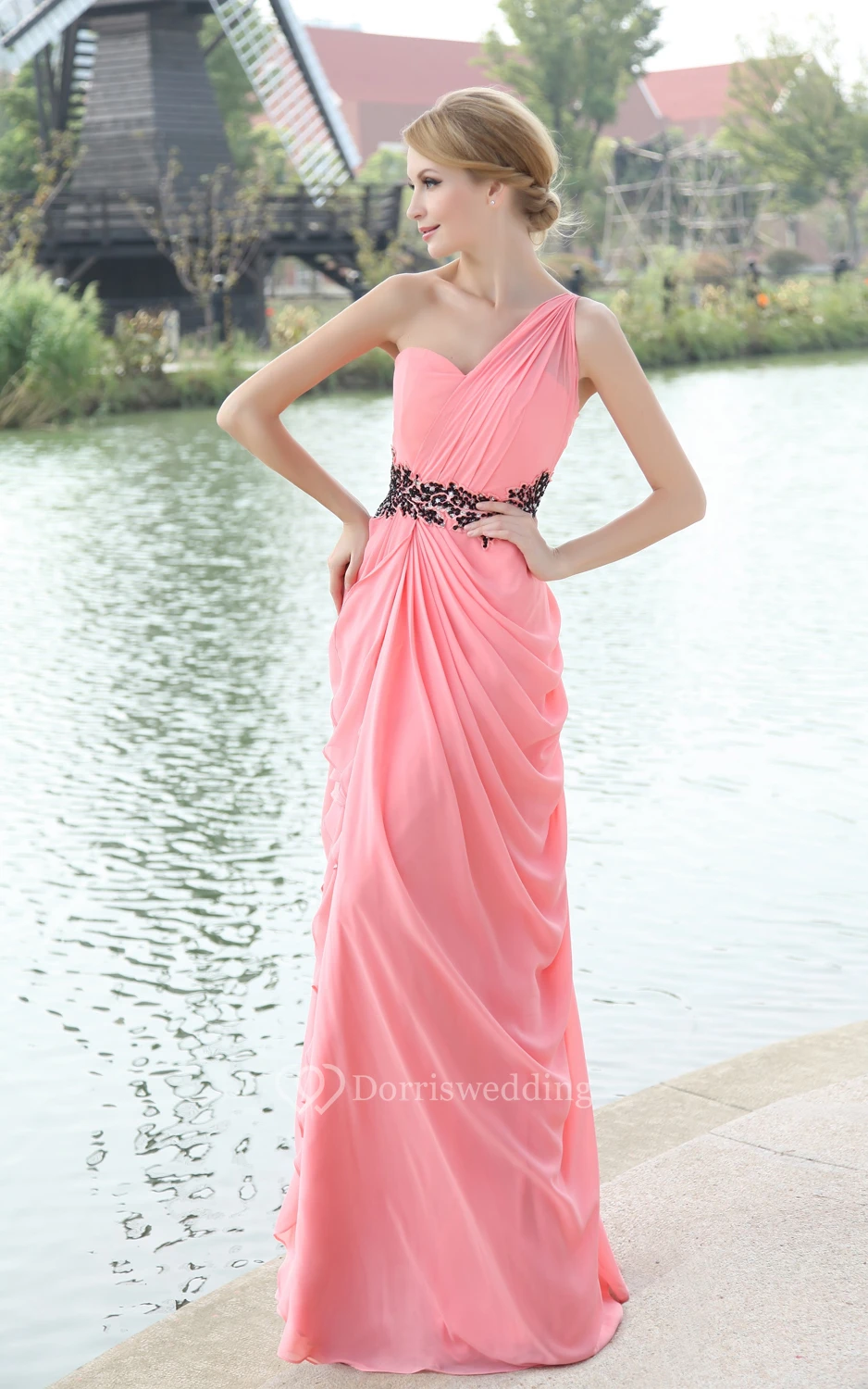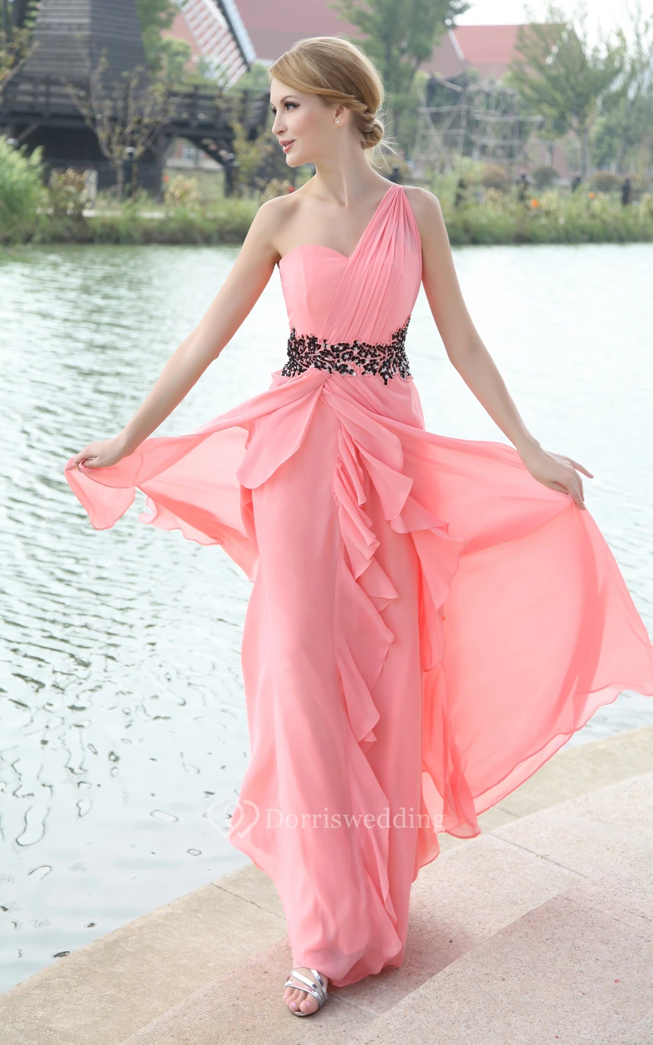 One-Shoulder Chiffon Dress With Pleating and Beaded Waistband