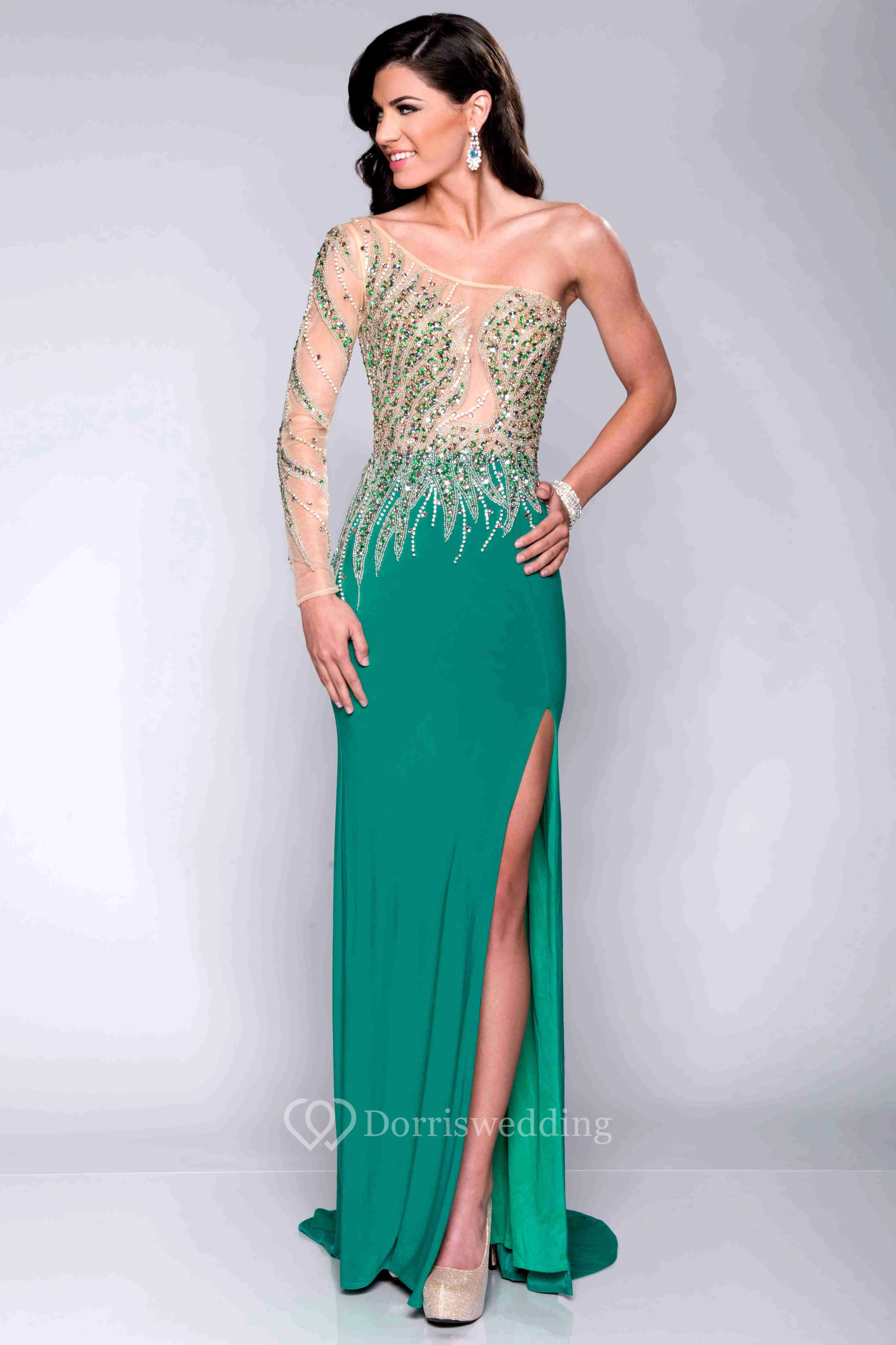 One-Shoulder Column Jersey Prom Dress With Sequined Bodice And Side Slit
