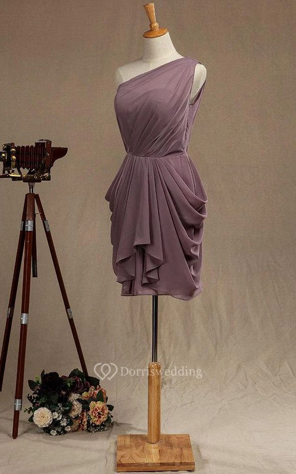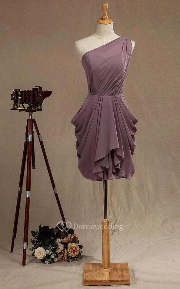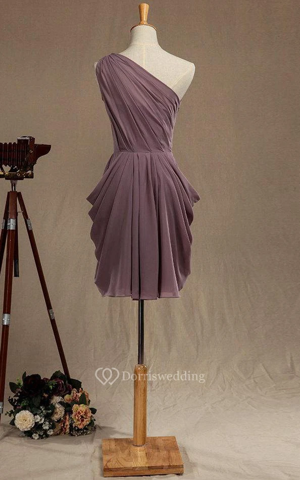 One Shoulder Dropped Knee Length Chiffon Dress With Pleats