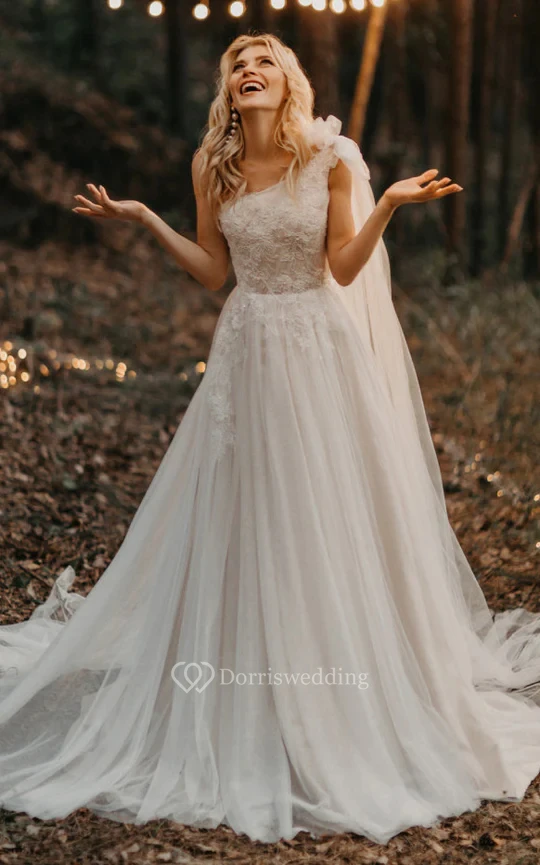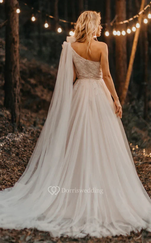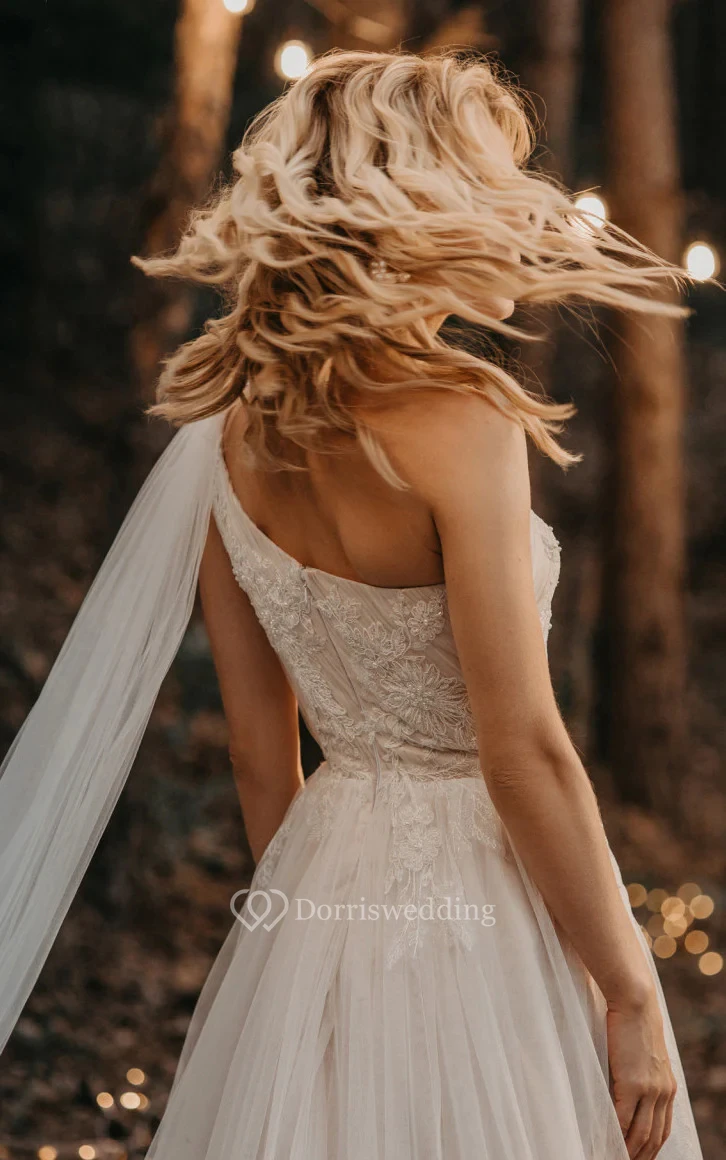 One-shoulder Empire A-line Lace Tulle Asymmetrical Country Wedding Dress