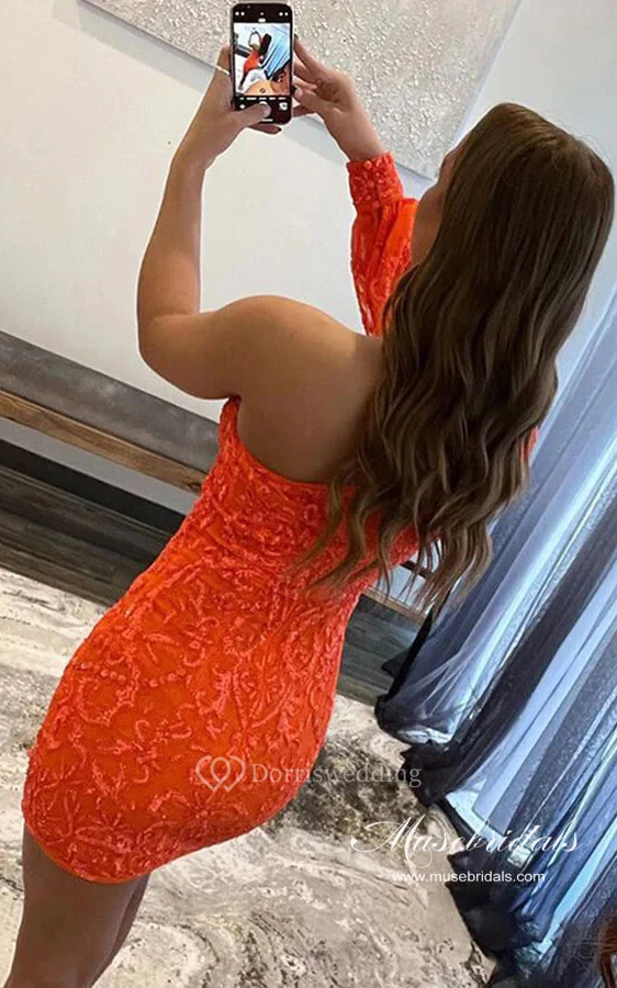 One-shoulder Pencil Bodycon Lace Papaya Crystal Detailings