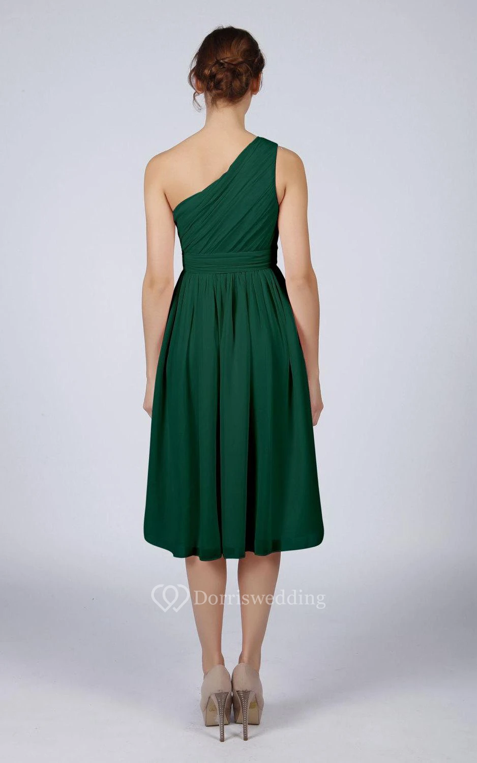 One Shoulder Pleated A-line Chiffon Tea Length Dress Forest Green
