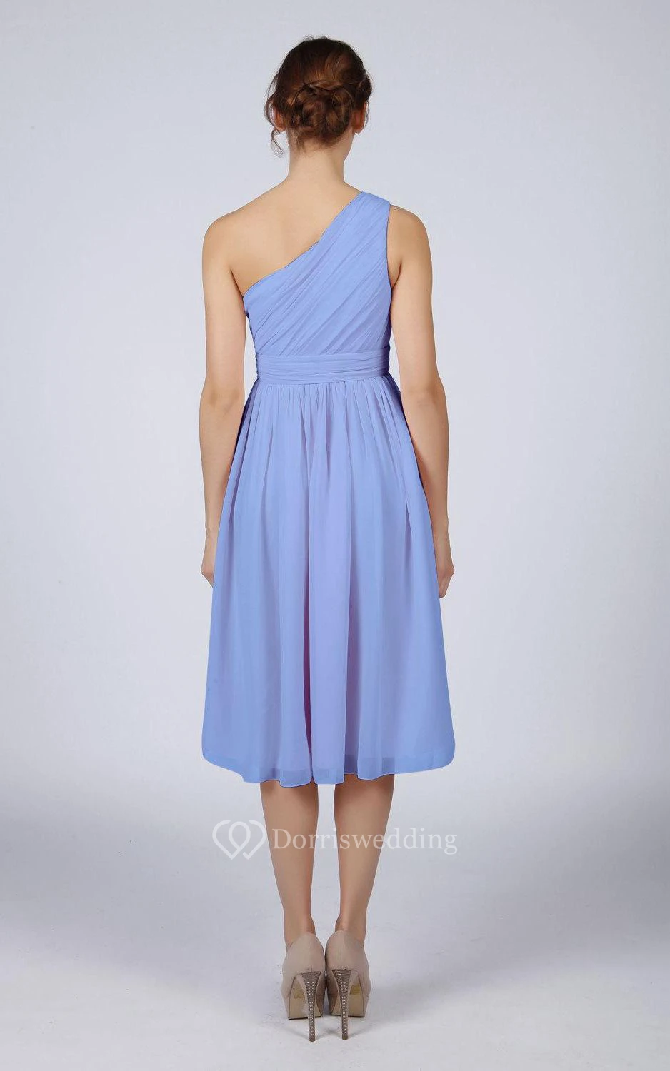 One Shoulder Pleated A-line Chiffon Tea Length Dress Kingfisher Blue