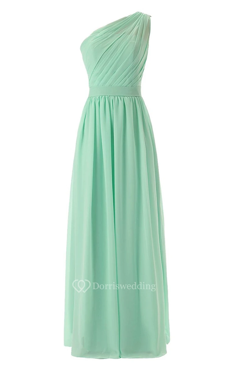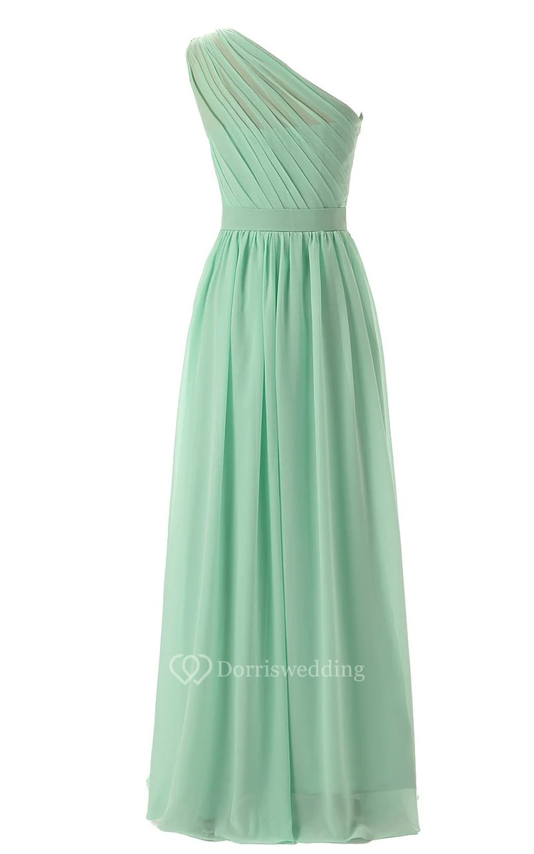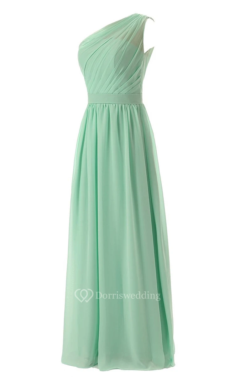 One-shoulder Pleated Chiffon A-line Gown With Satin Band