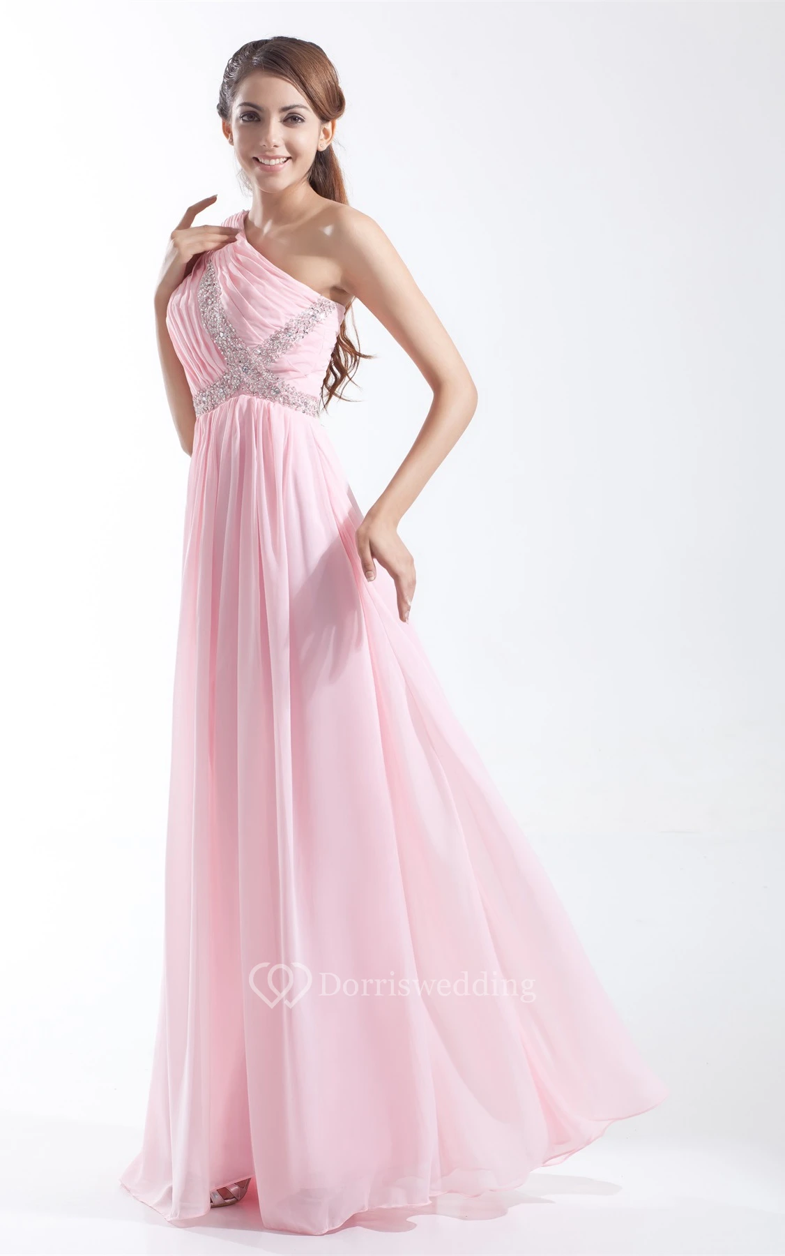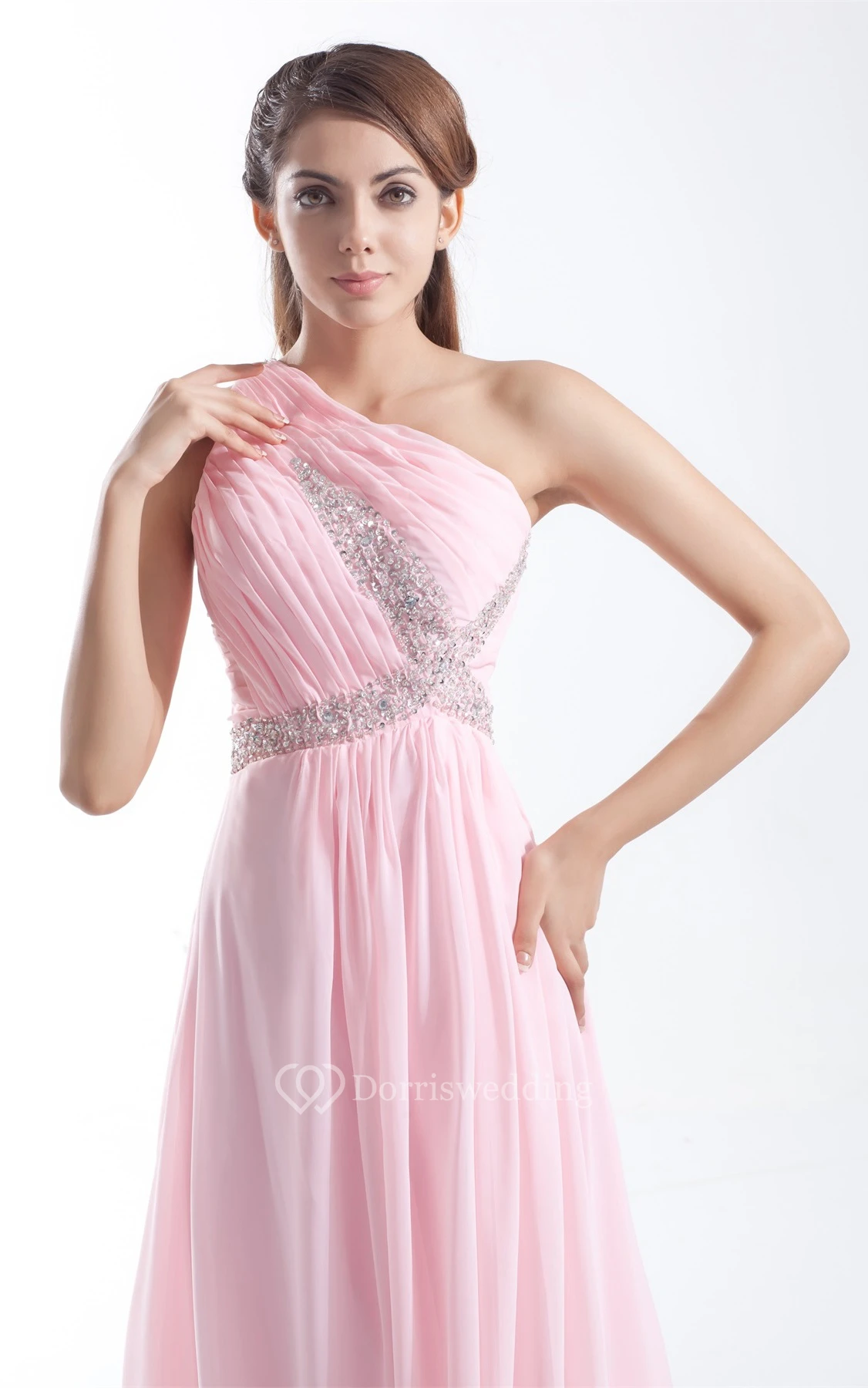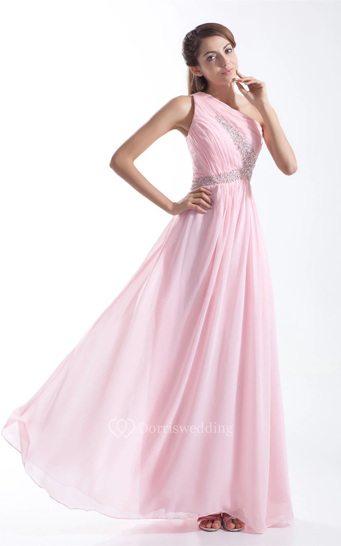 One-Shoulder Pleated Chiffon Gown With Crystal Detailing