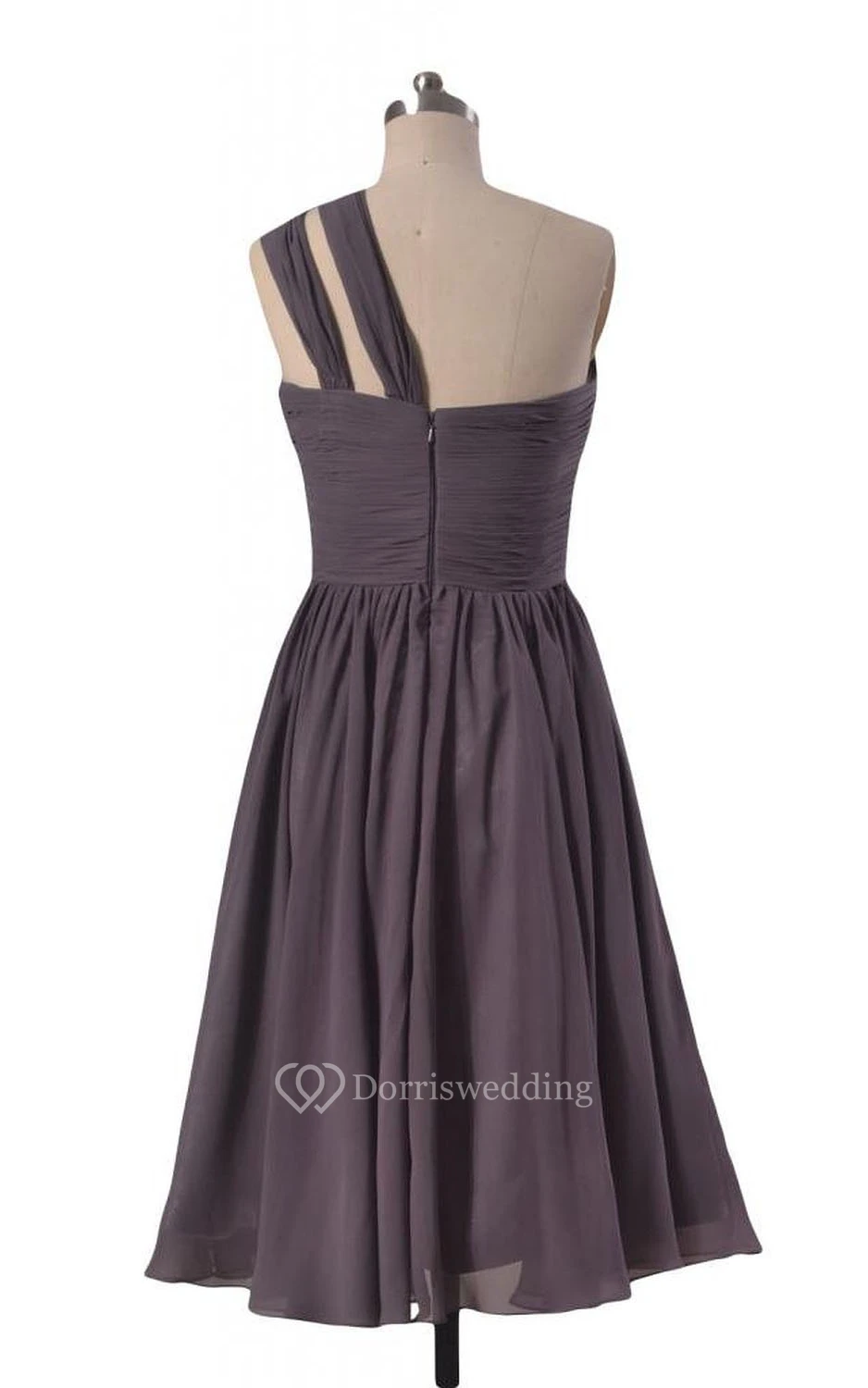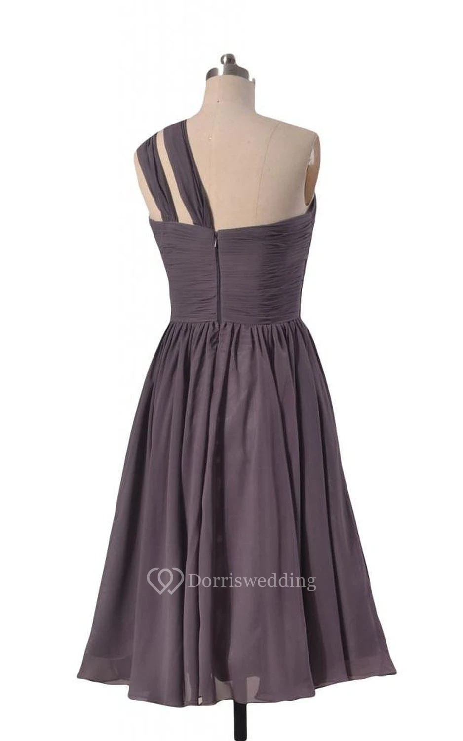 One-shoulder Ruched Bodice Knee-length Pleated Chiffon Dress