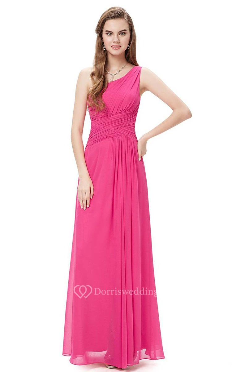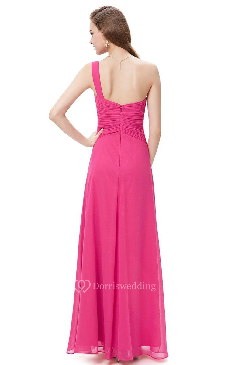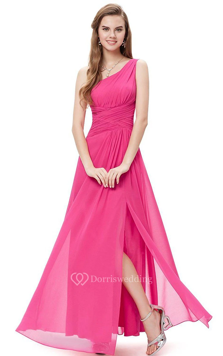 One-shoulder Ruched Chiffon Dress With Side Slit