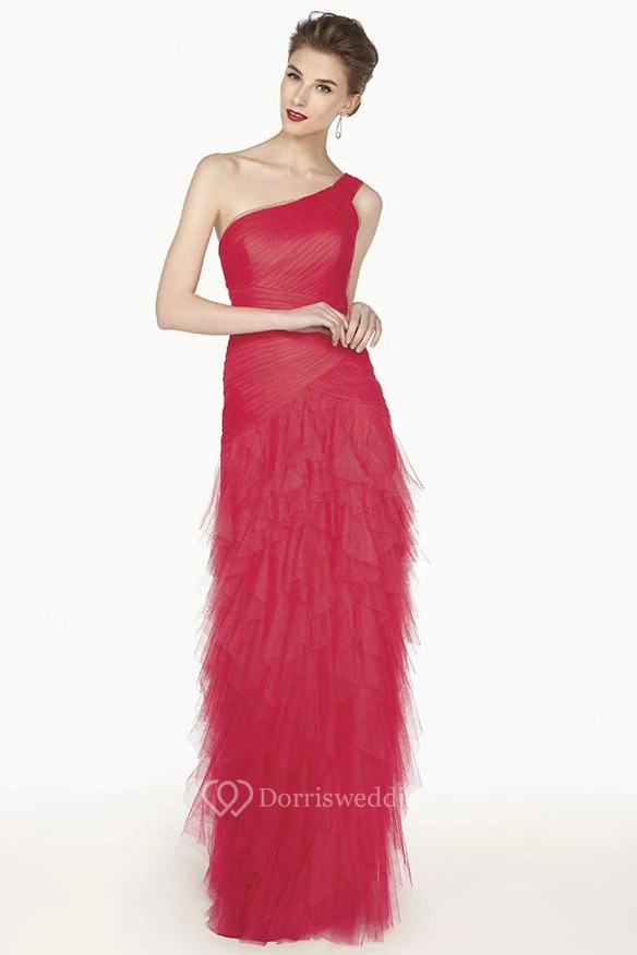 One Shoulder Sheath Tiered Tulle Long Prom Dress With Criss Cross Bandage