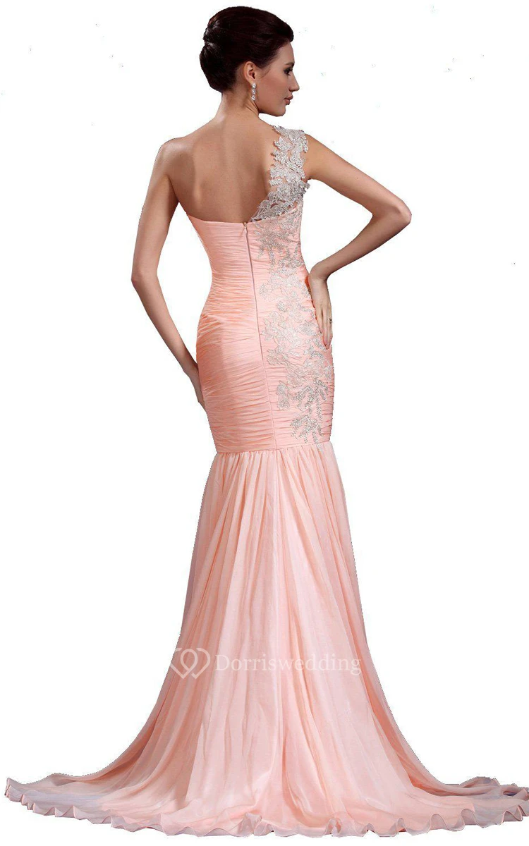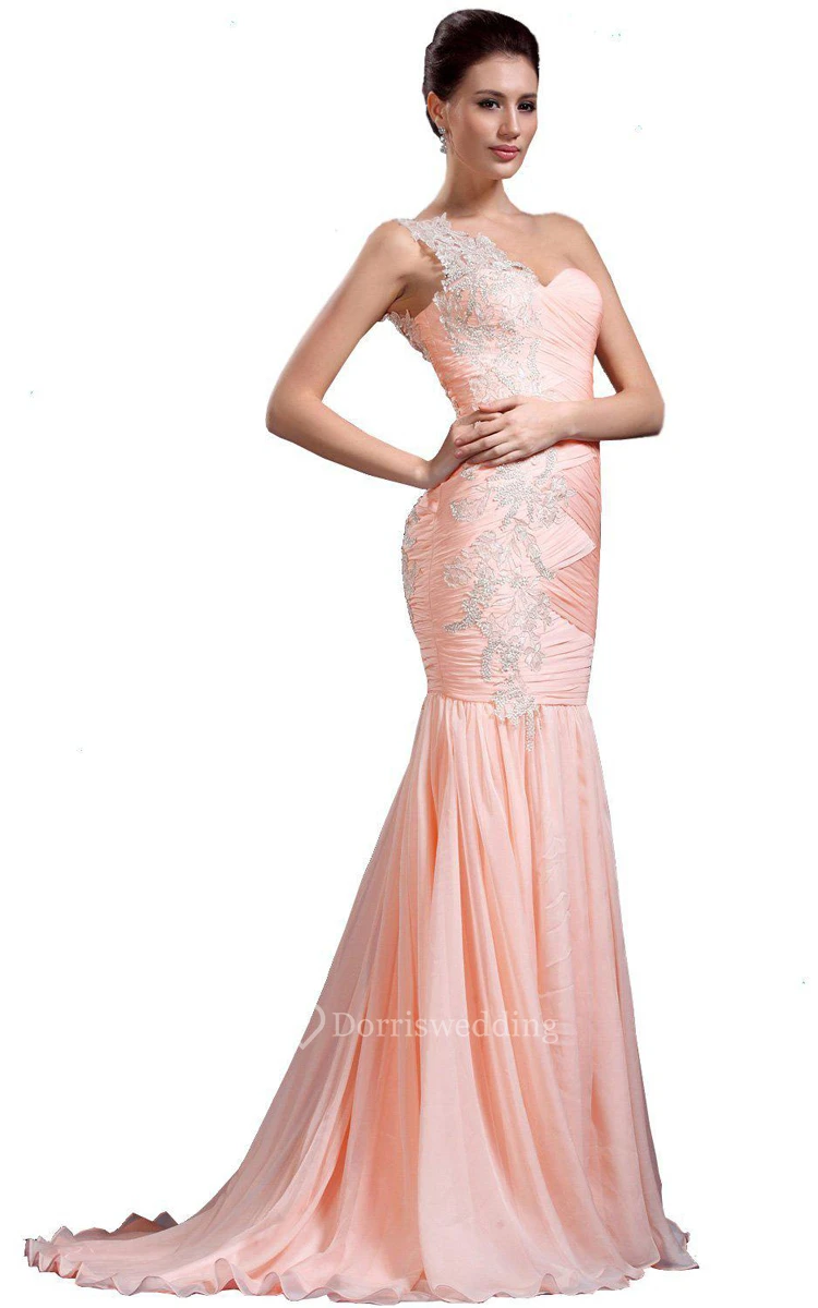 One-shoulder Trumpet Gown With Pleats and Appliques