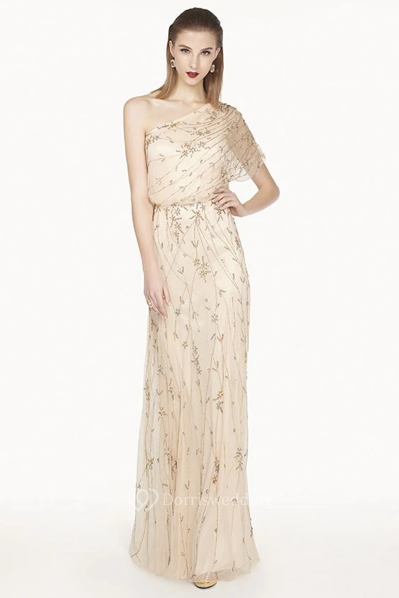 One Shoulder Tulle Long Prom Dress With Single Batwing Sleeve And Embroidery