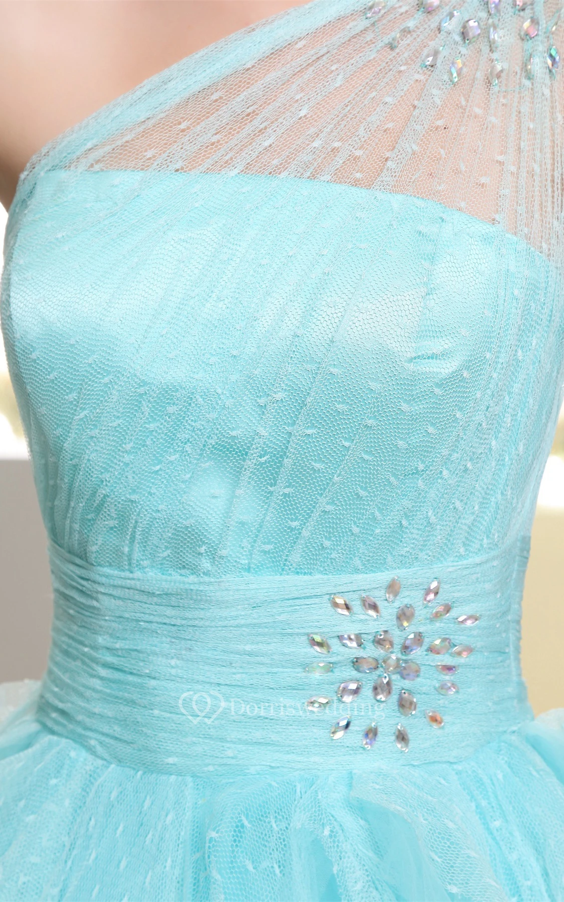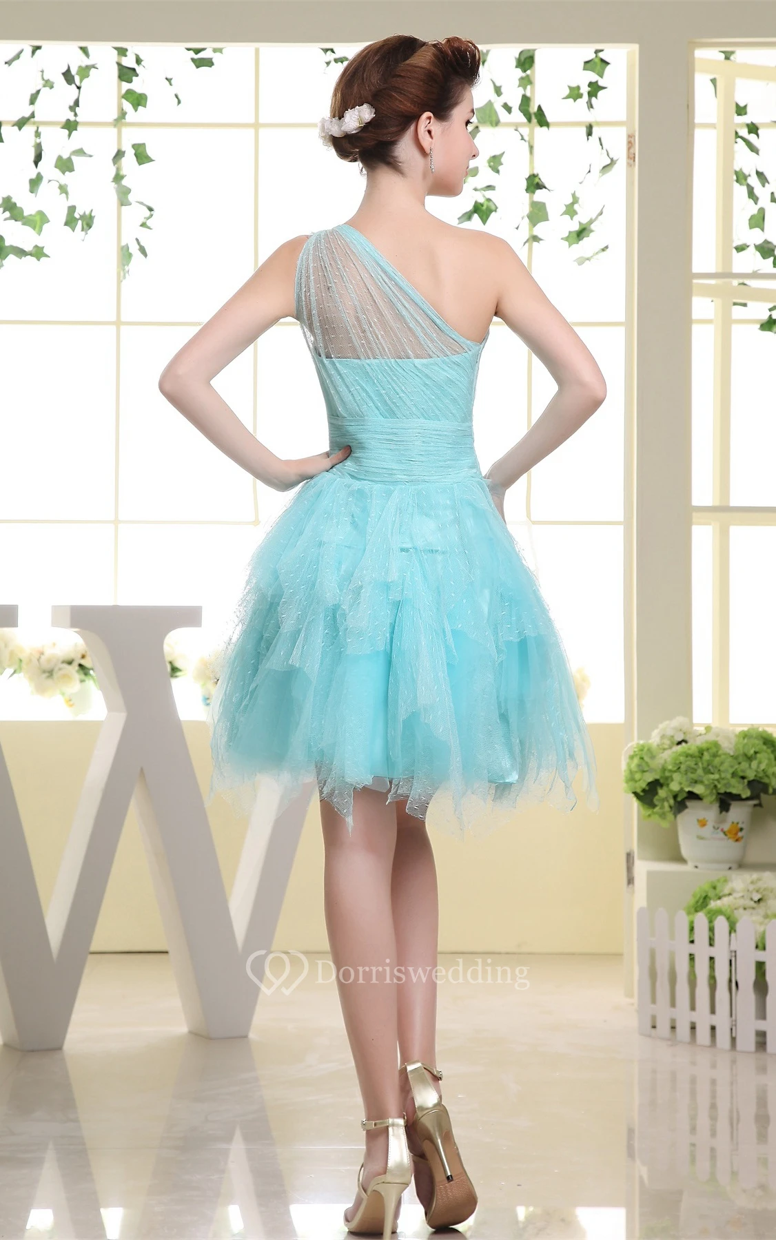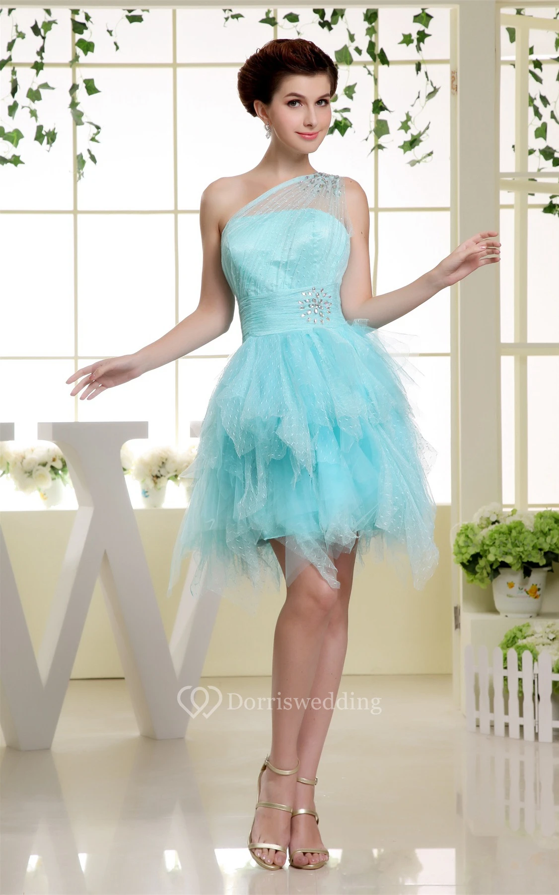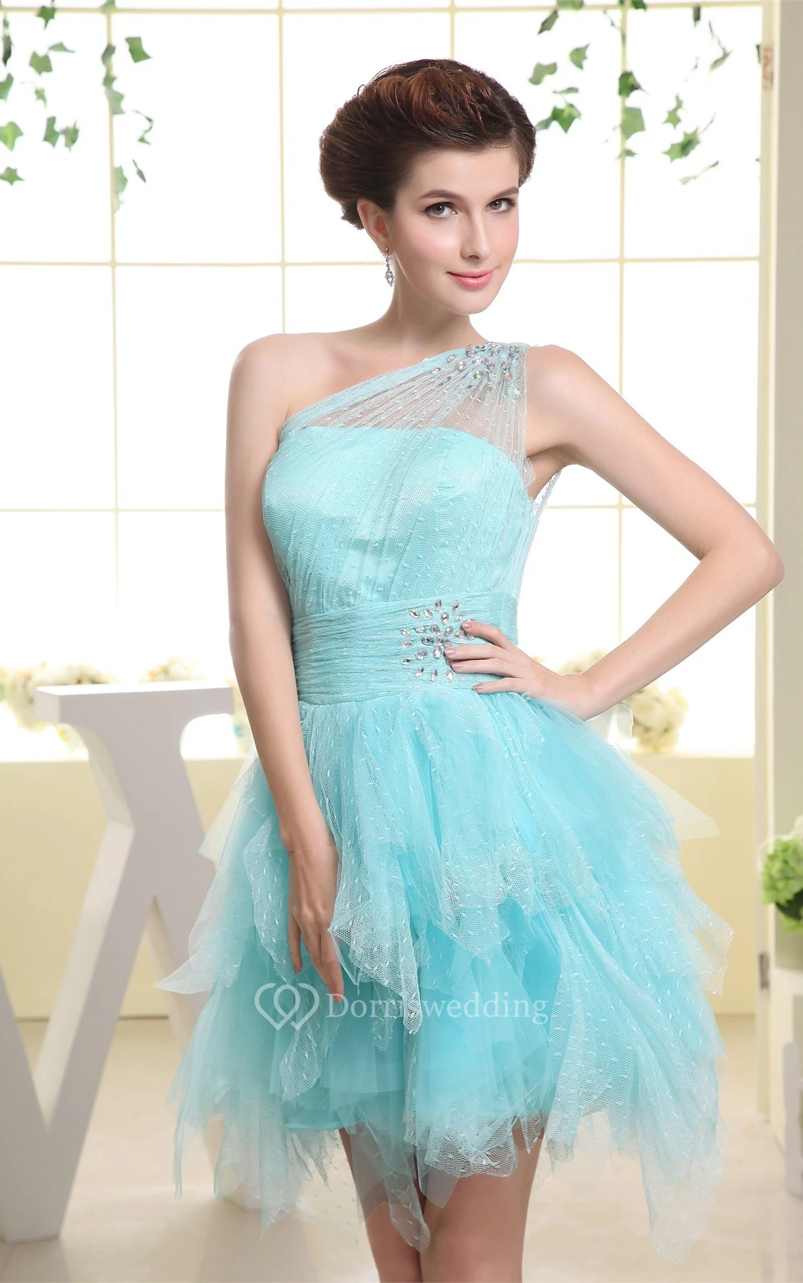 One-Shoulder Tulle Short Ruffled Dress With Beading Illusion Neckline
