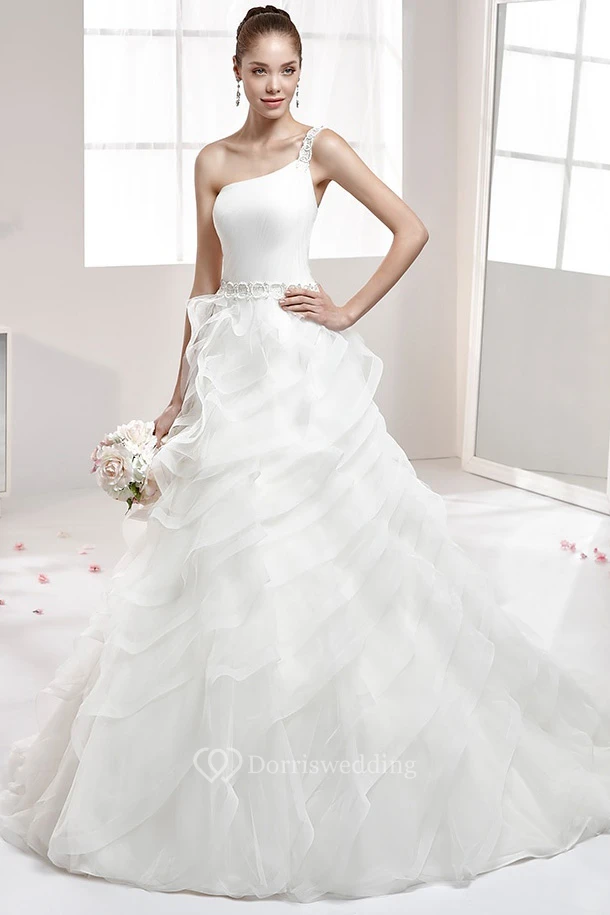 One-Strap Pleating A-Line Gown With Beaded Belt And Ruffled Skirt