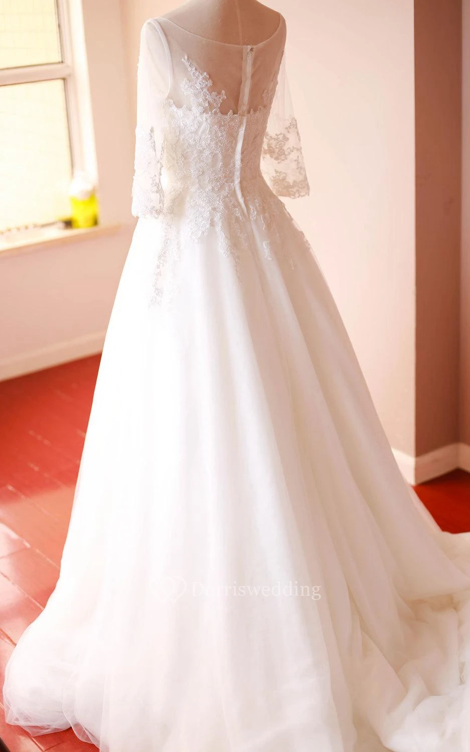 Organza A-Line 3-4 Sleeve Gown With Lace Appliques and Bateau Neck