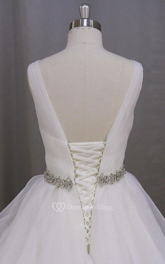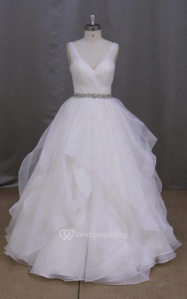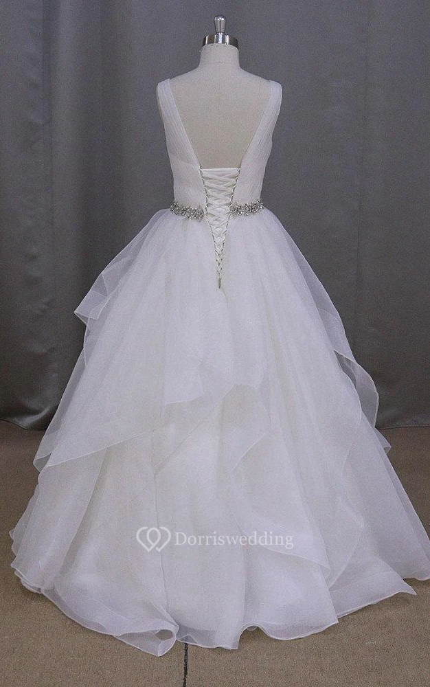 Organza V-Neck Sleeveless Dress With Ruffles and Beaded Waist