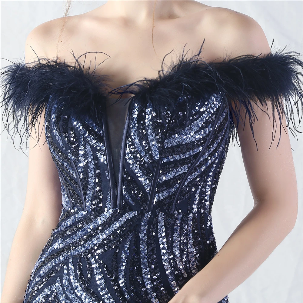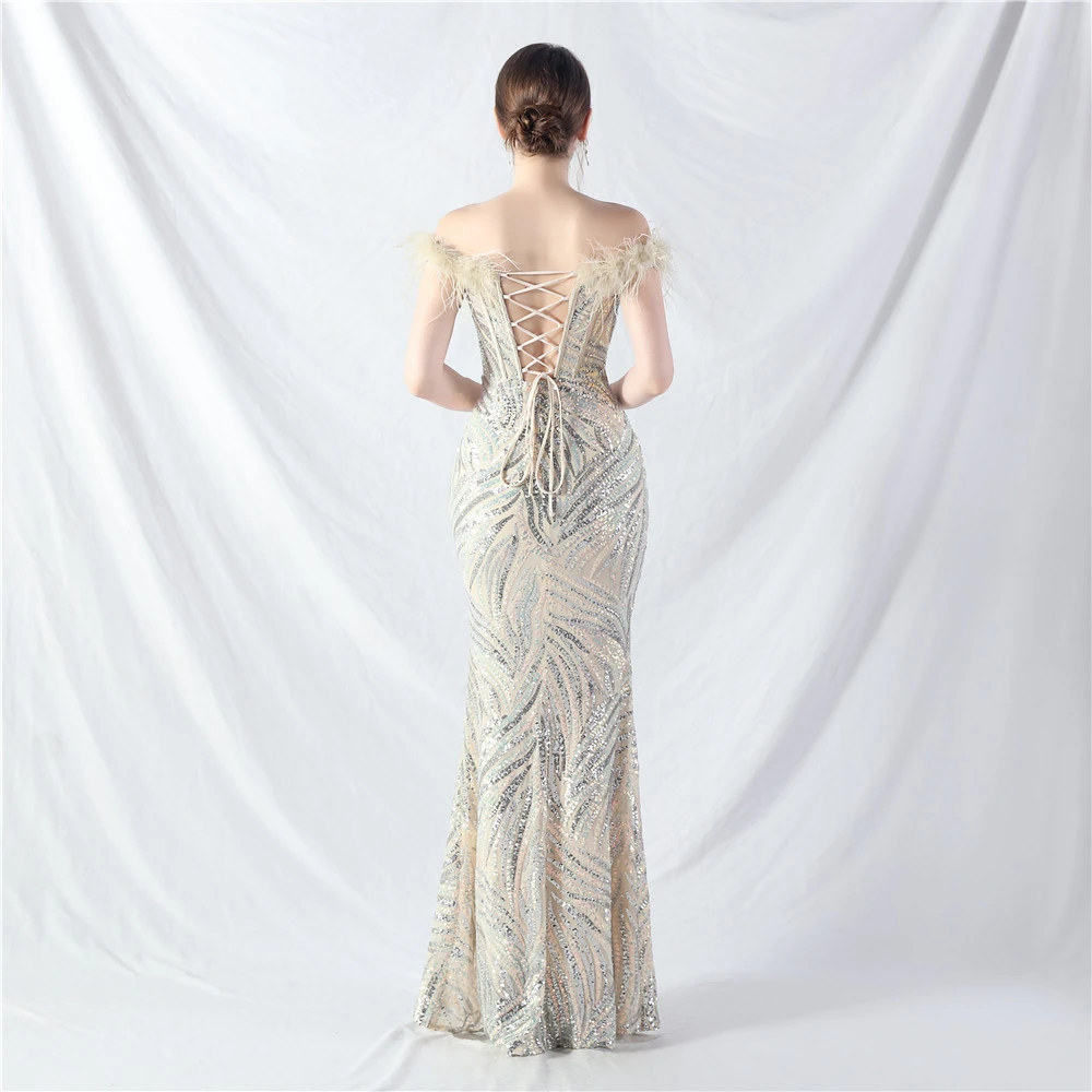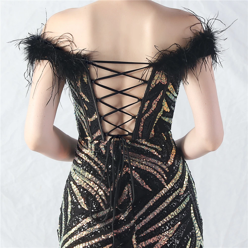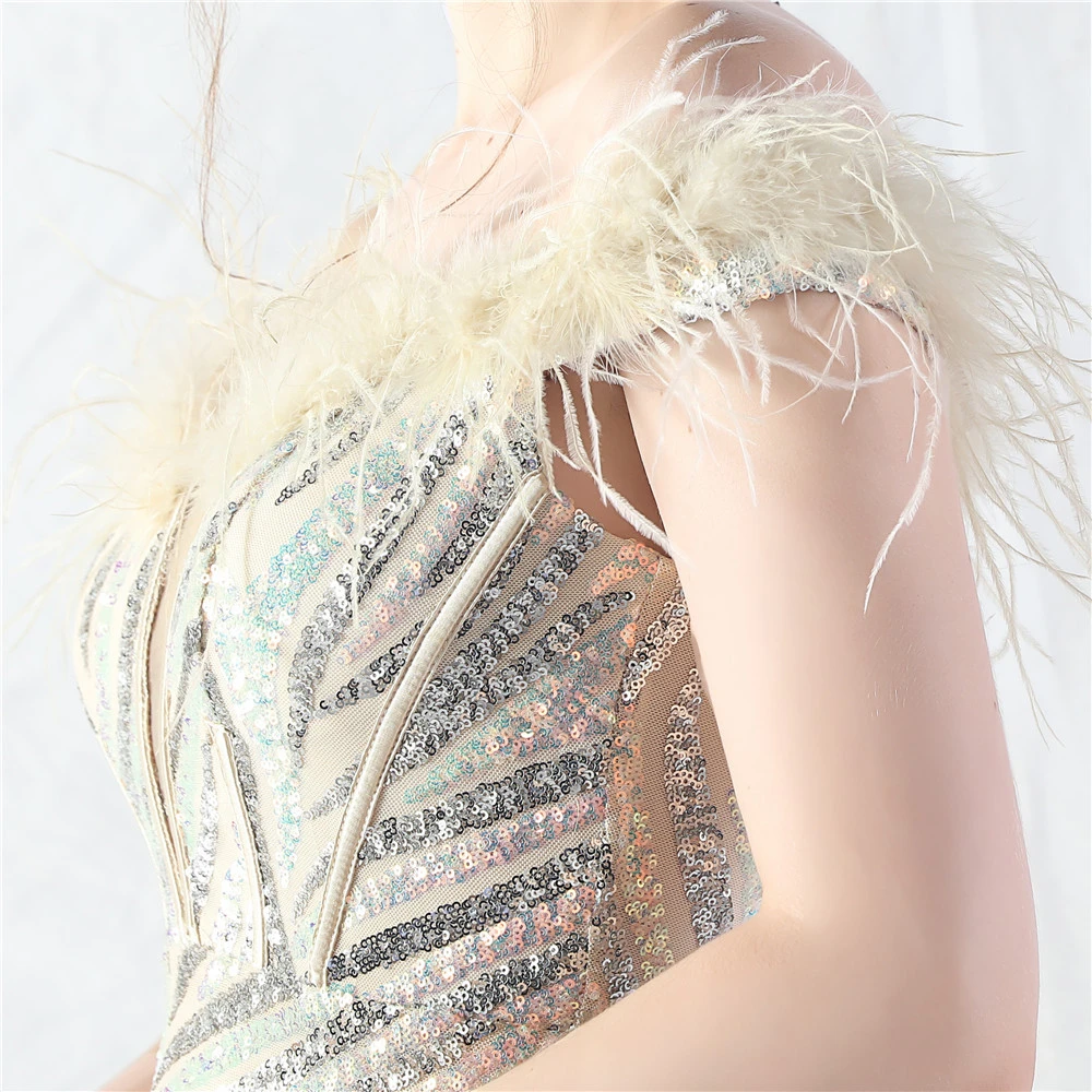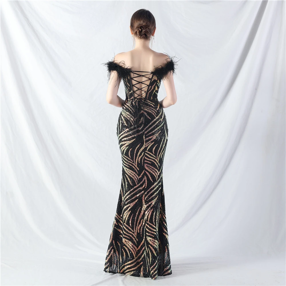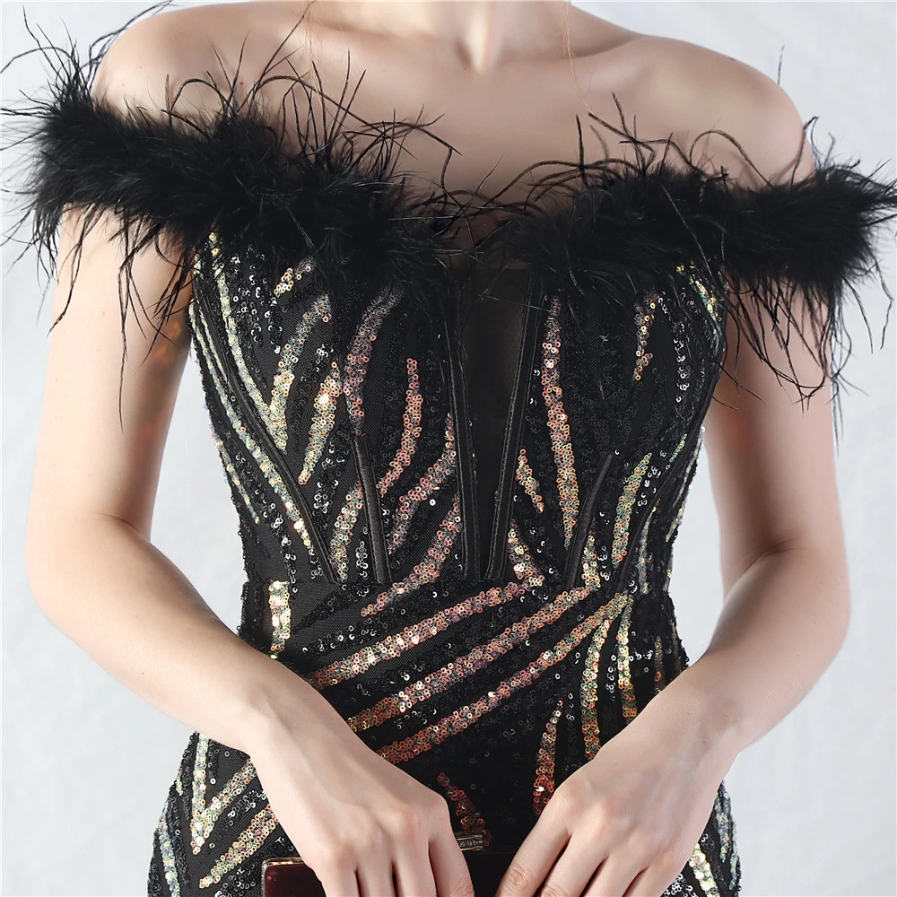 Palace Fishbone Waisted Vest Crafted Ostrich Feather High-End Sequin Evening Dress
