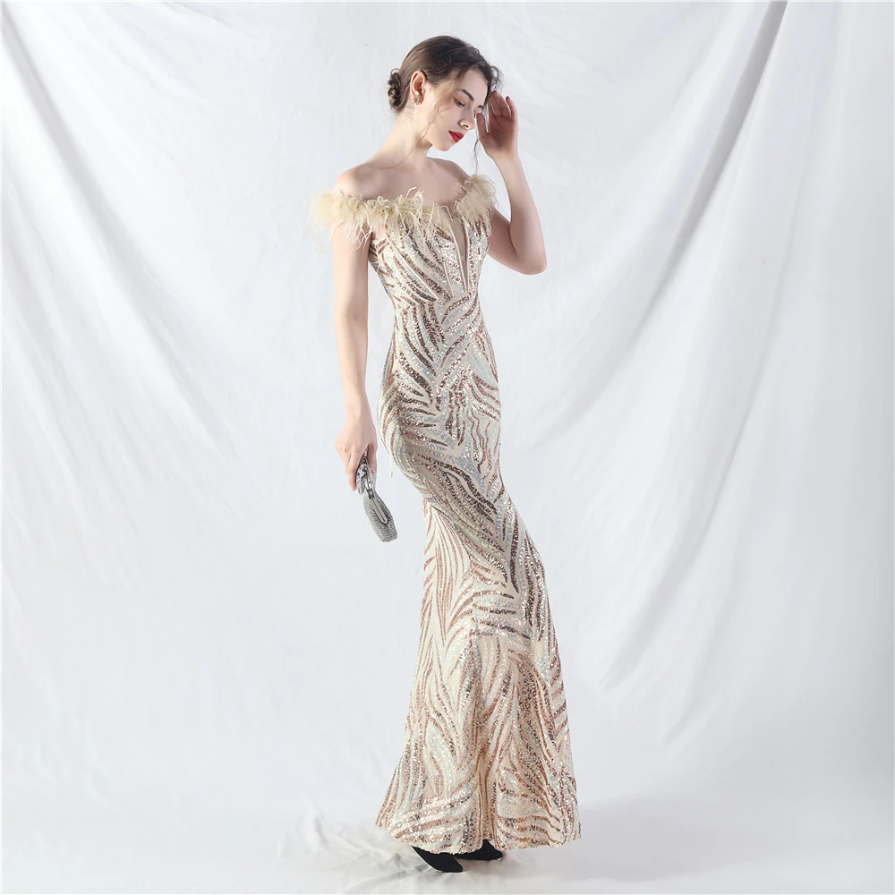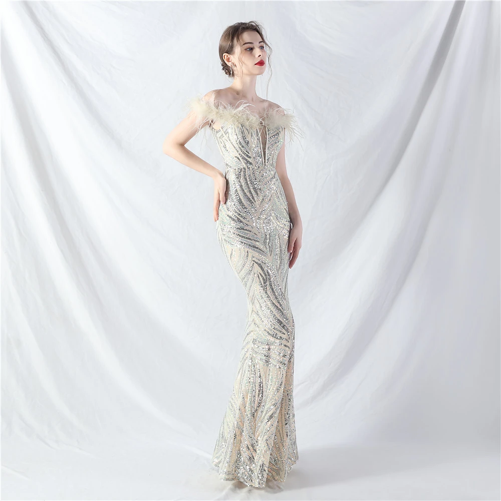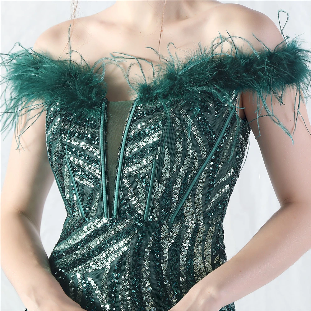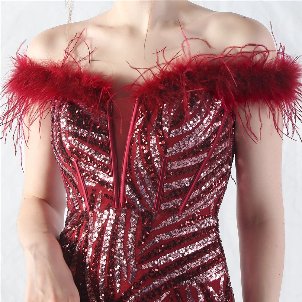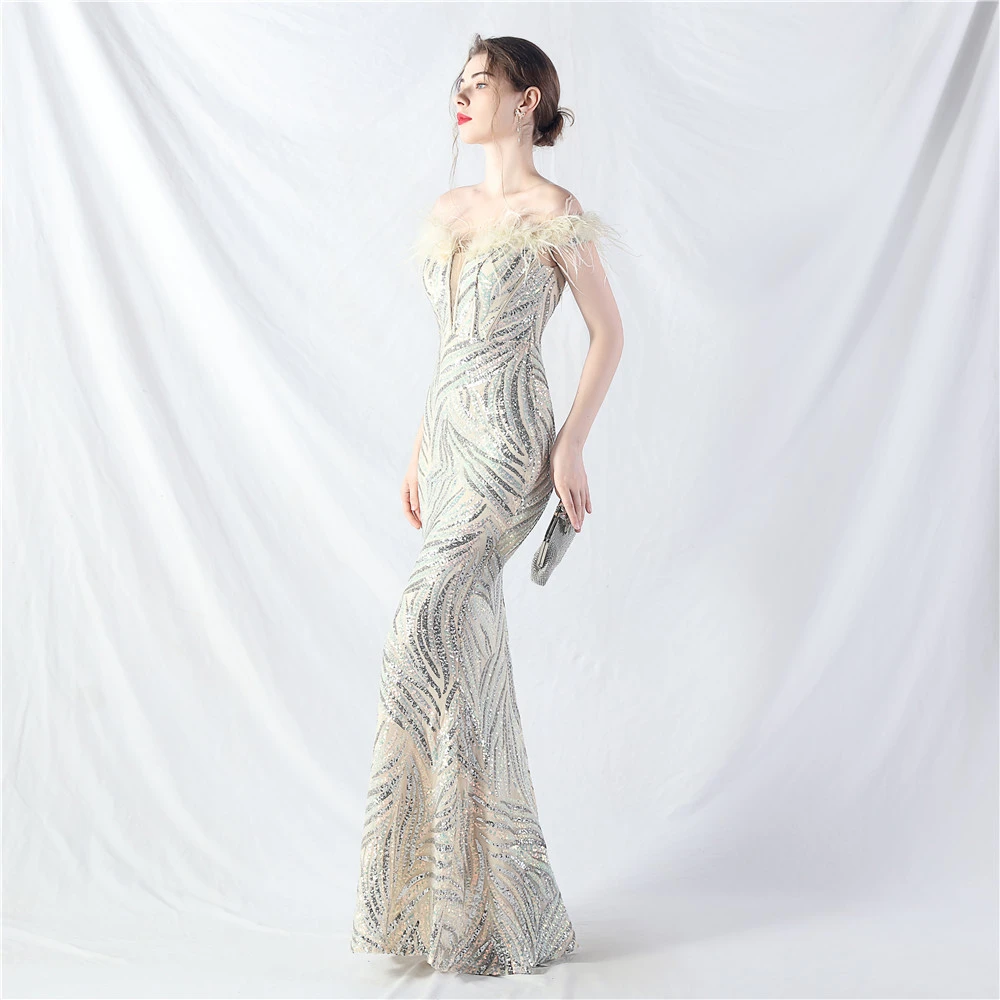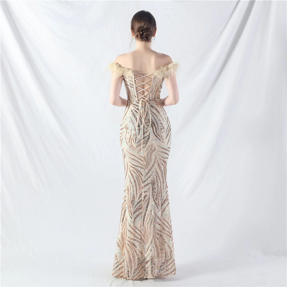Palace Fishbone Waisted Vest Crafted Ostrich Feather High-End Sequin Evening Dress