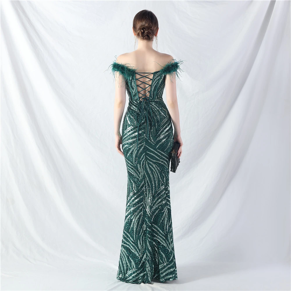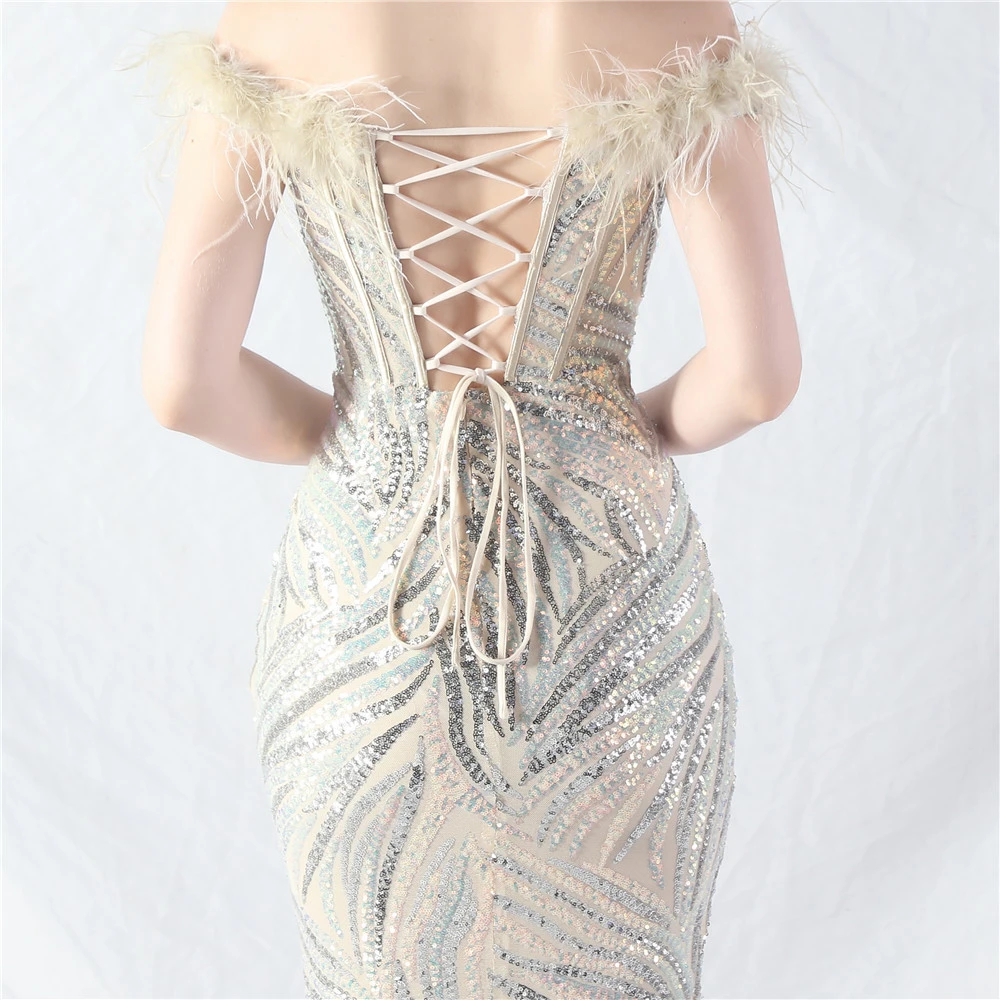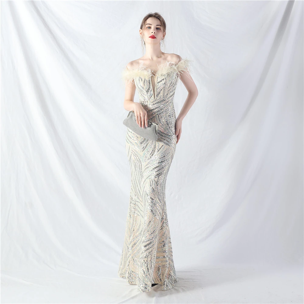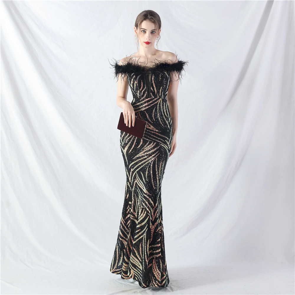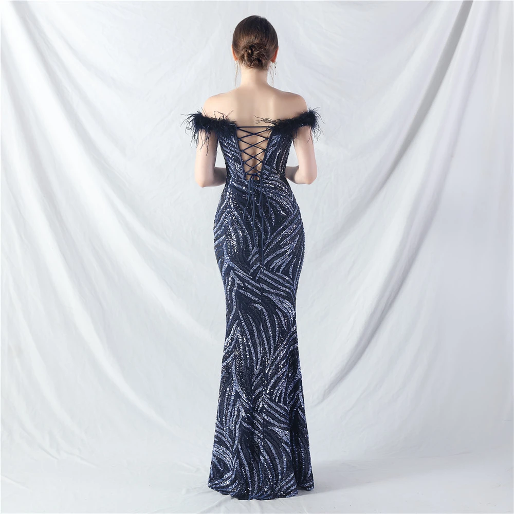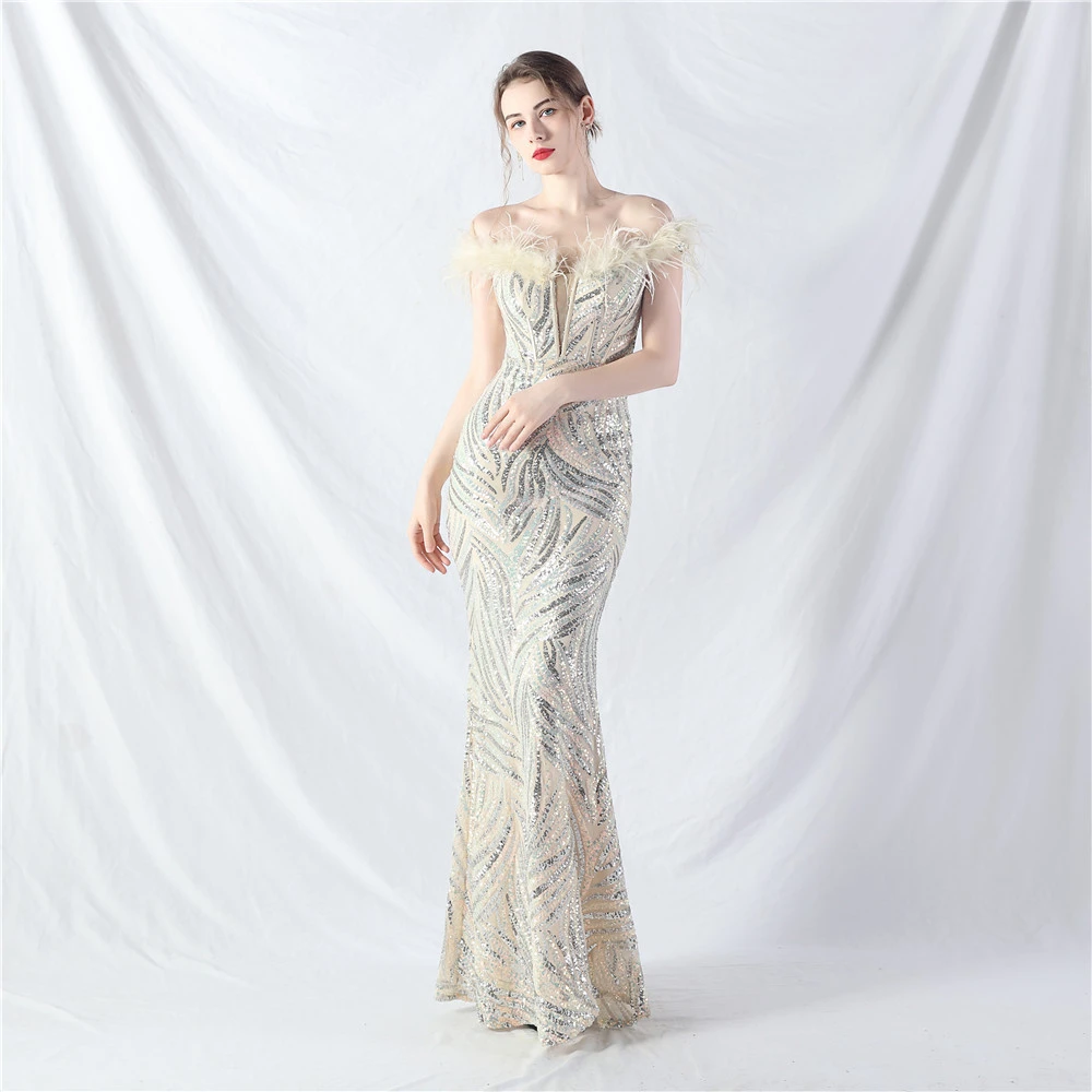 Palace Fishbone Waisted Vest Crafted Ostrich Feather High-End Sequin Evening Dress