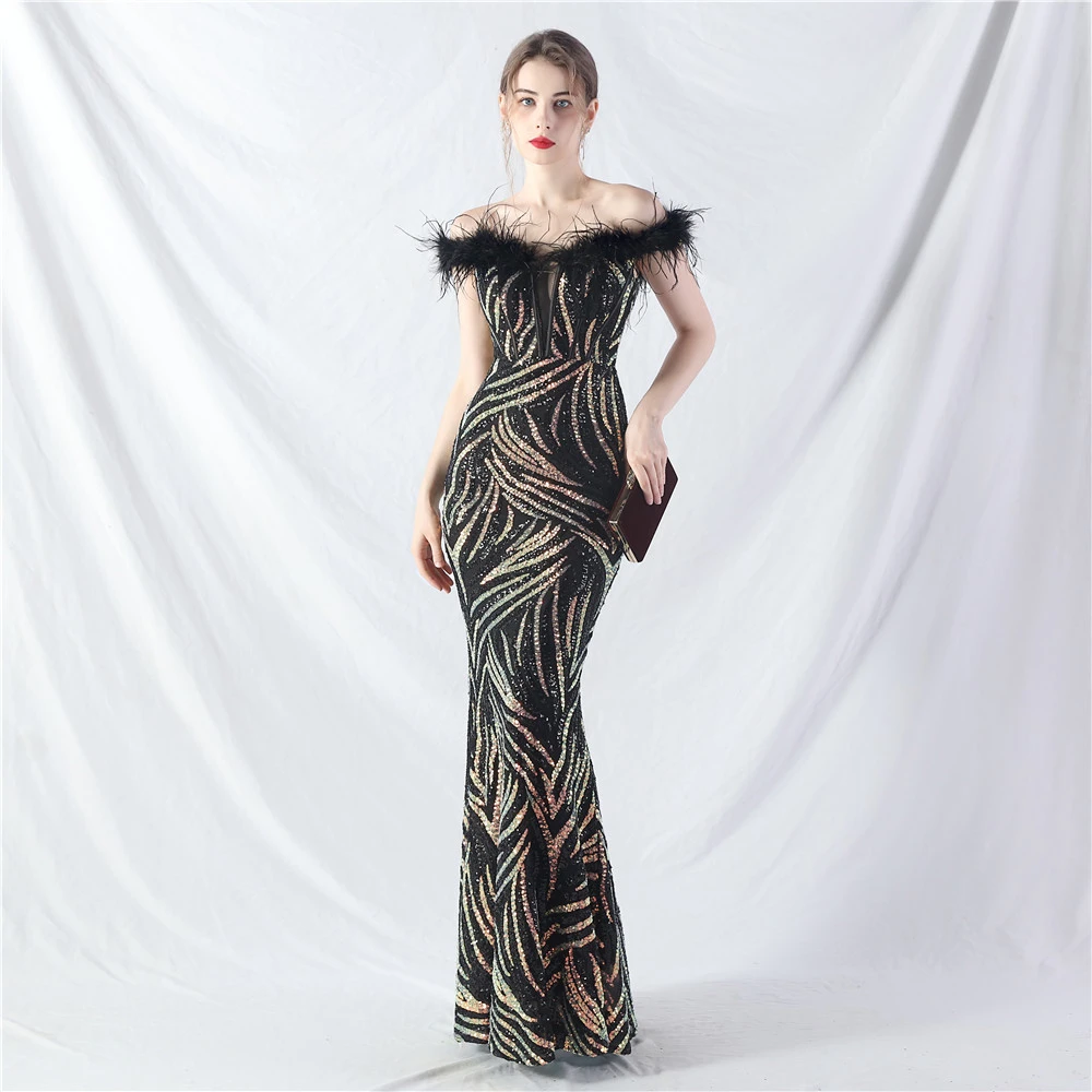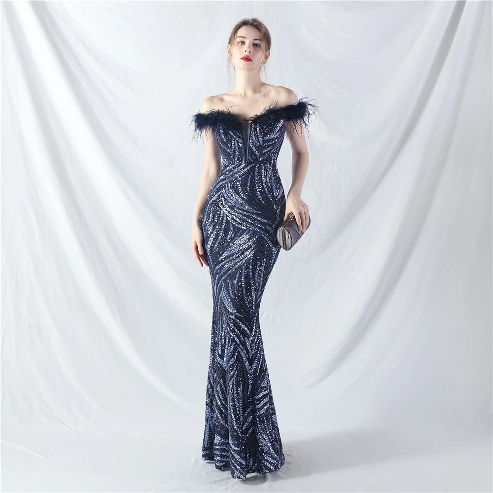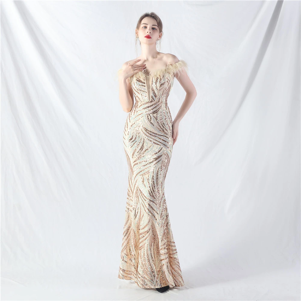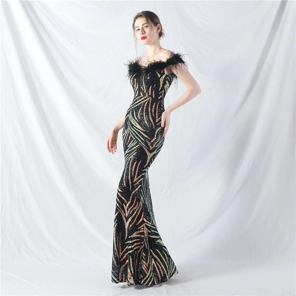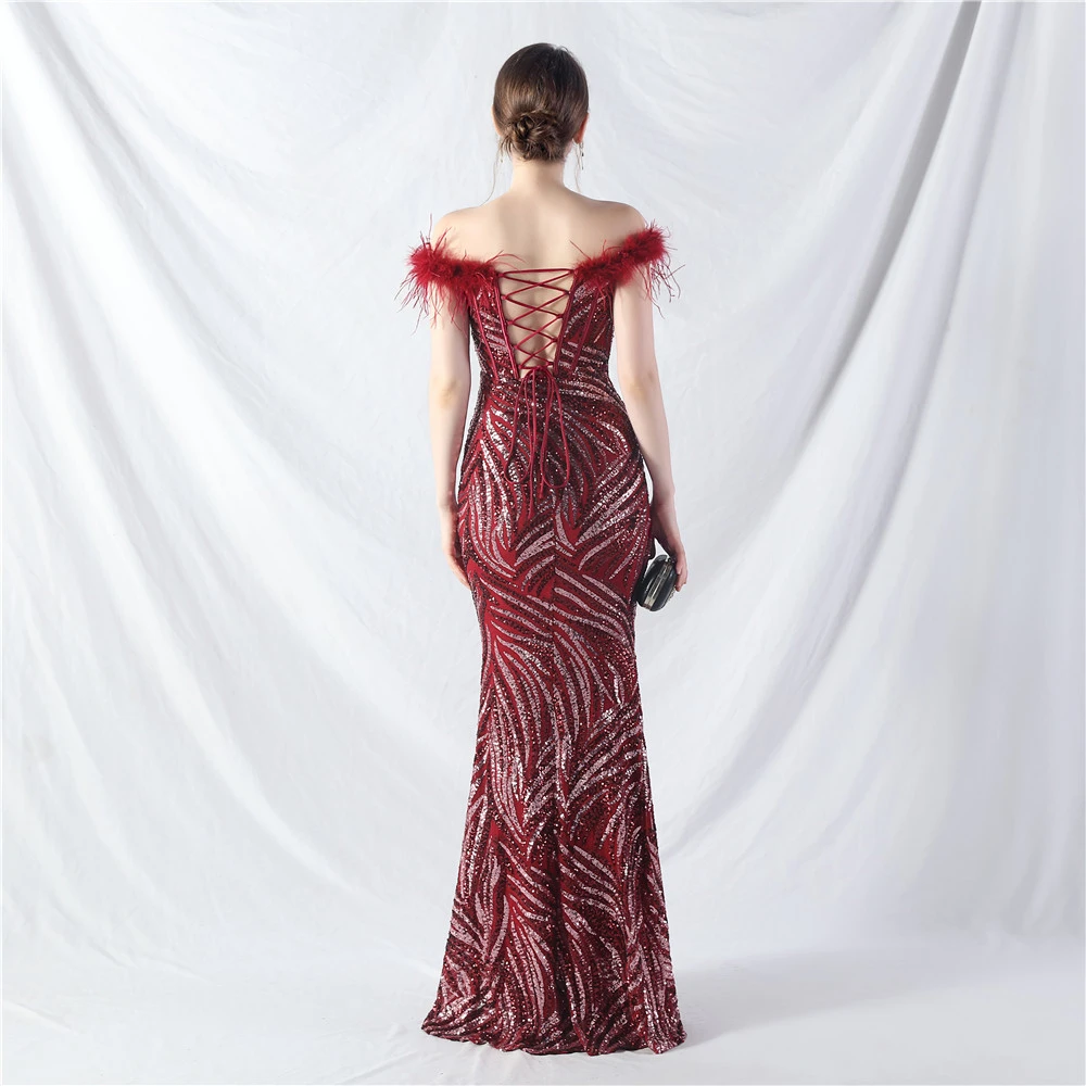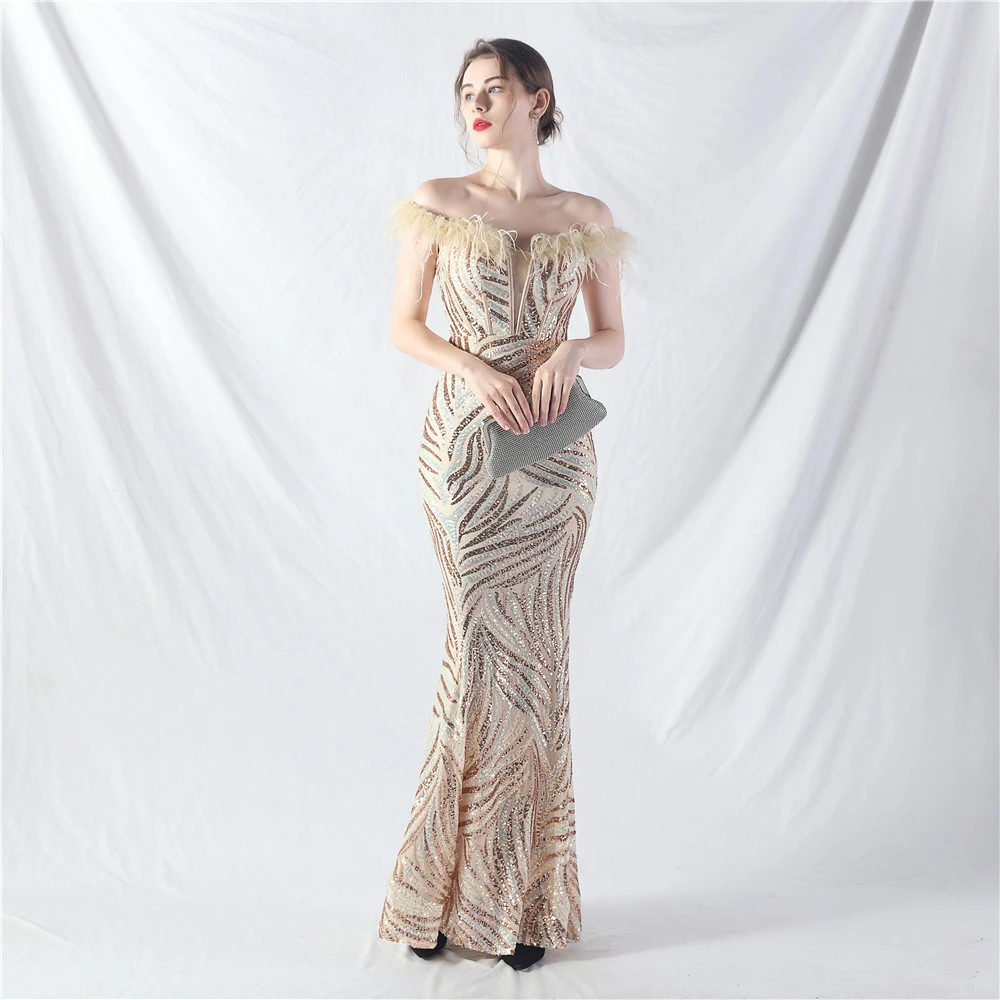 Palace Fishbone Waisted Vest Crafted Ostrich Feather High-End Sequin Evening Dress