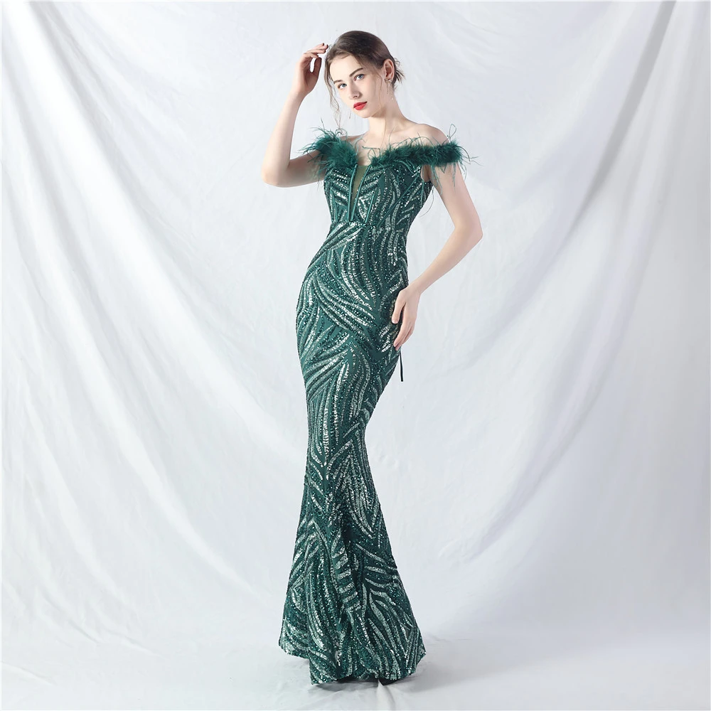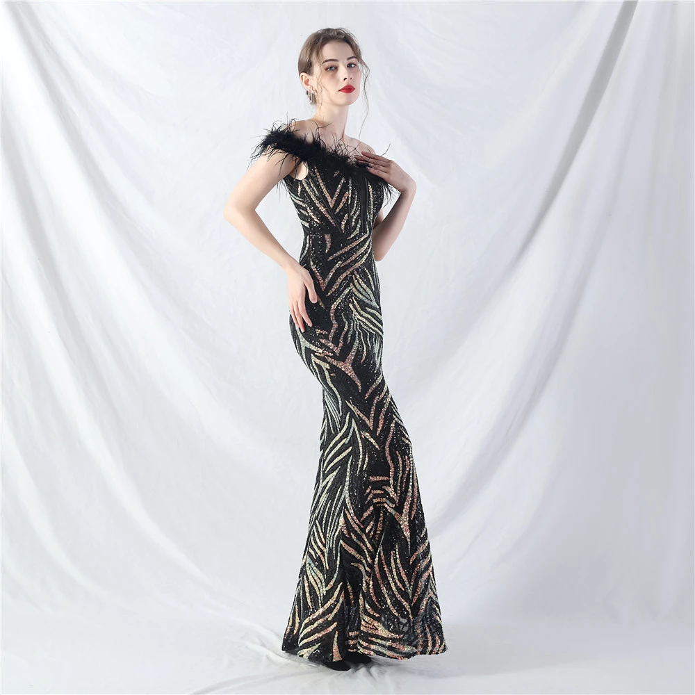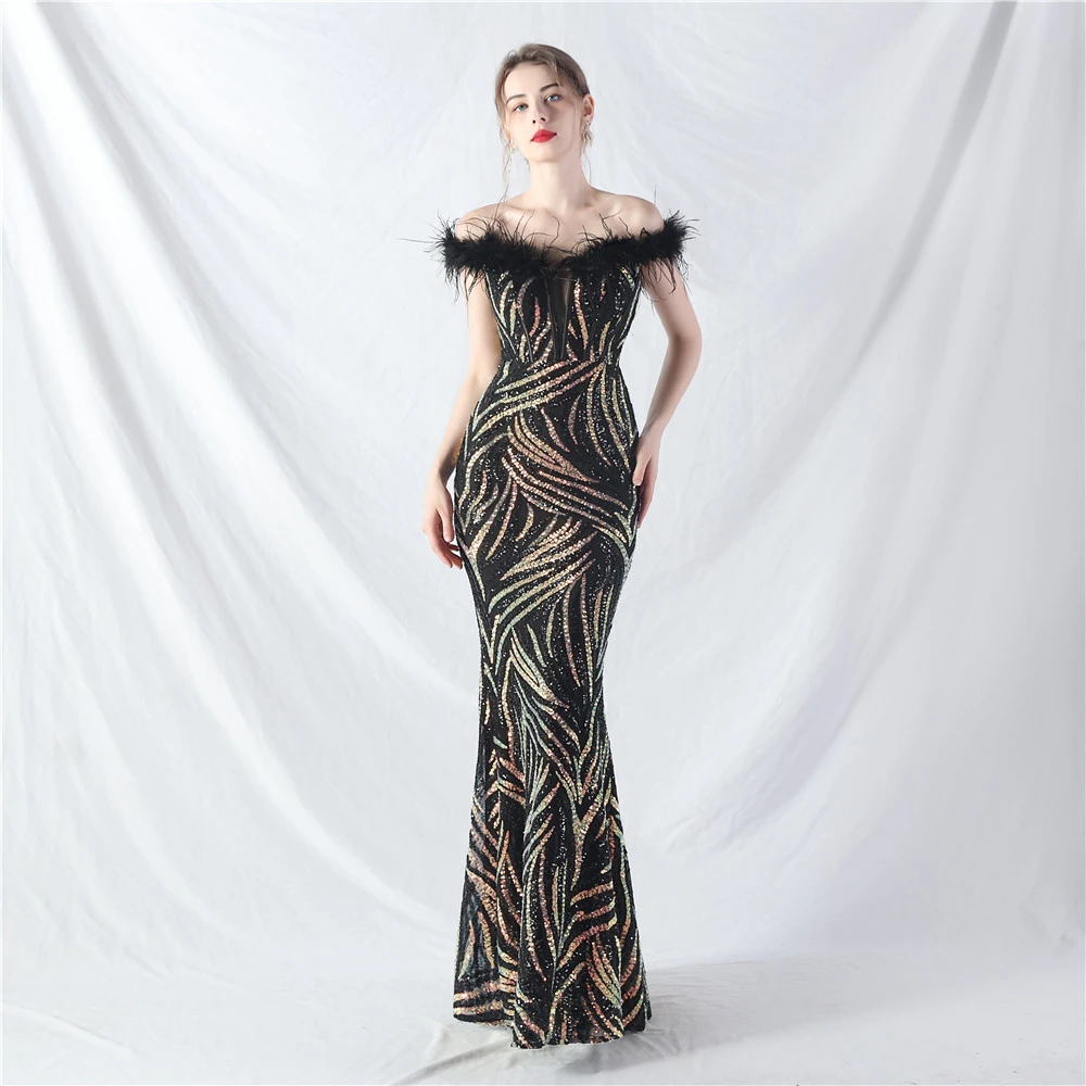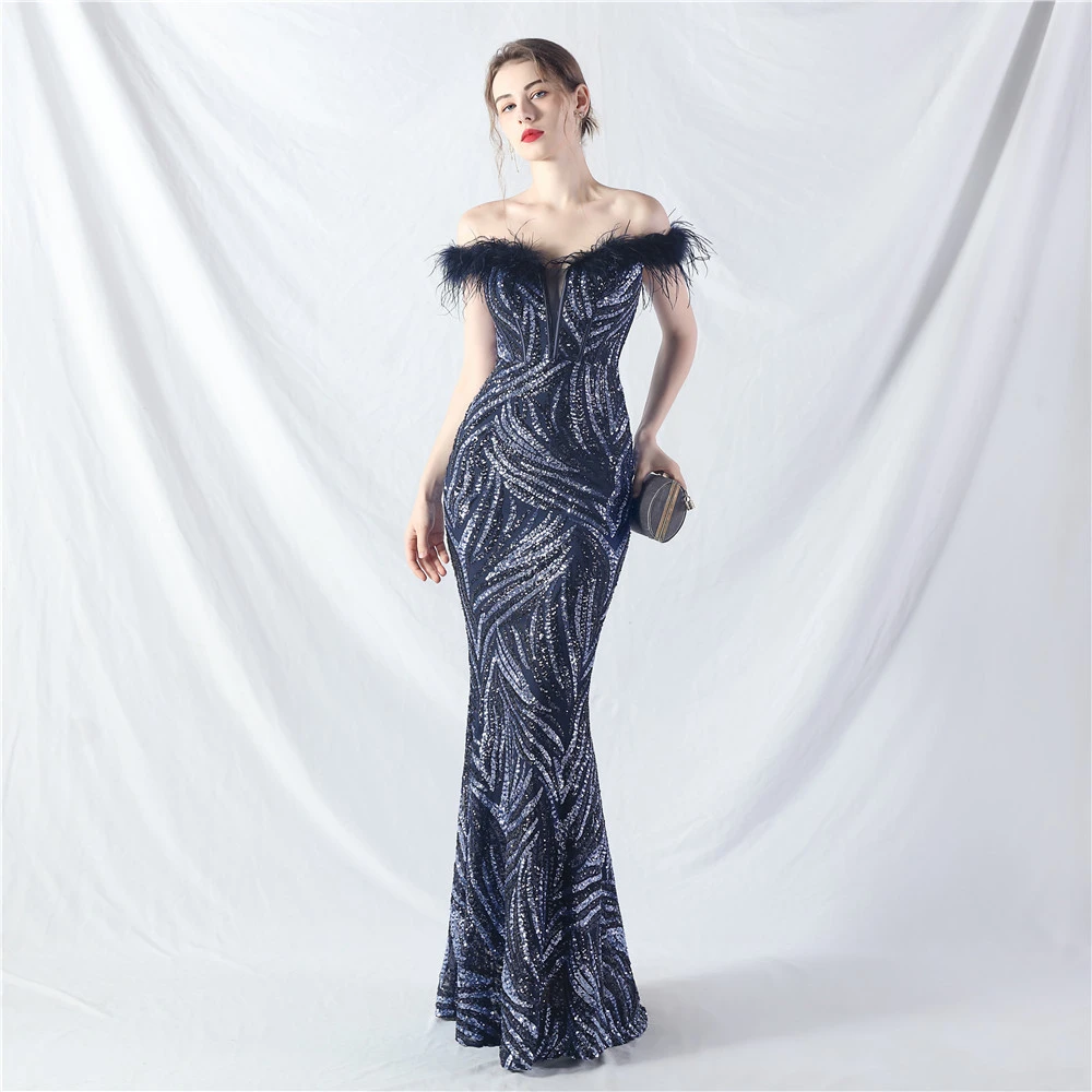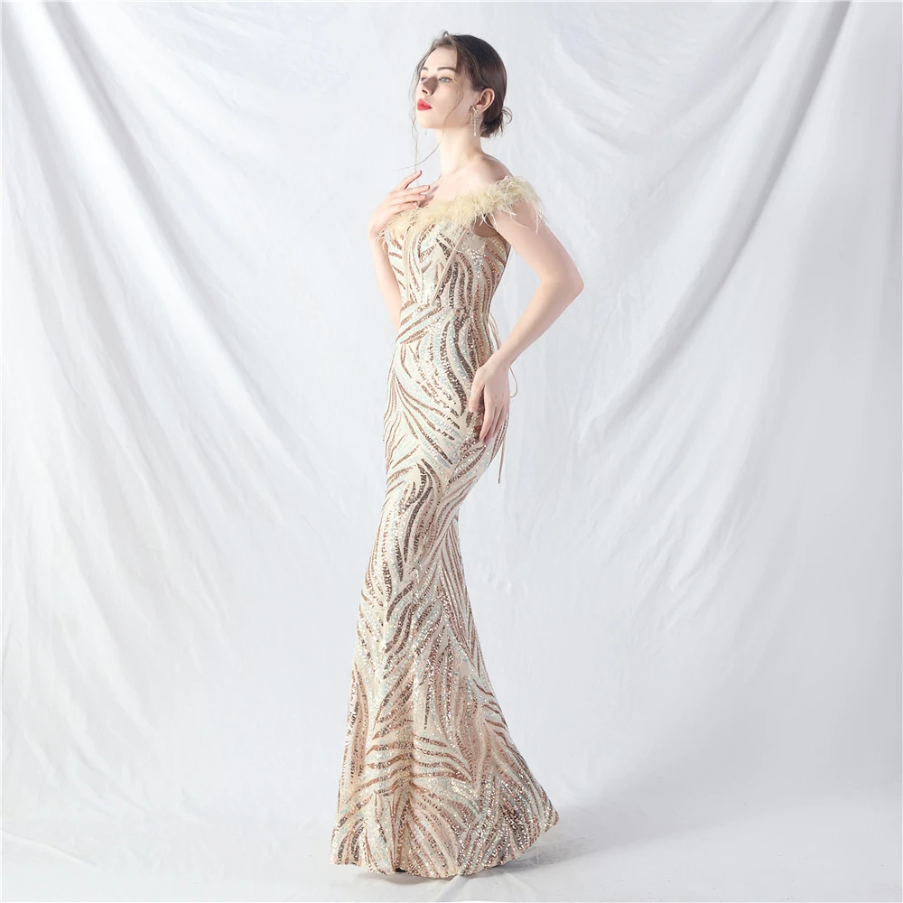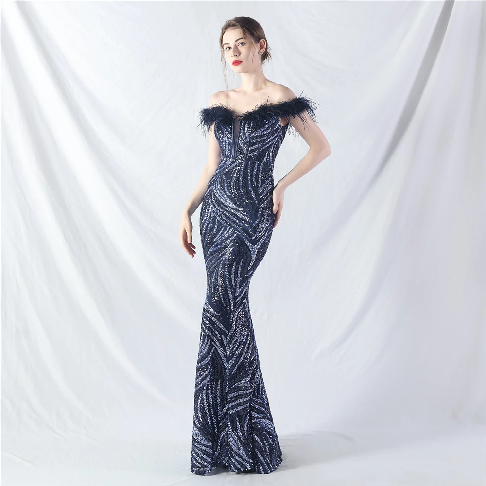 Palace Fishbone Waisted Vest Crafted Ostrich Feather High-End Sequin Evening Dress