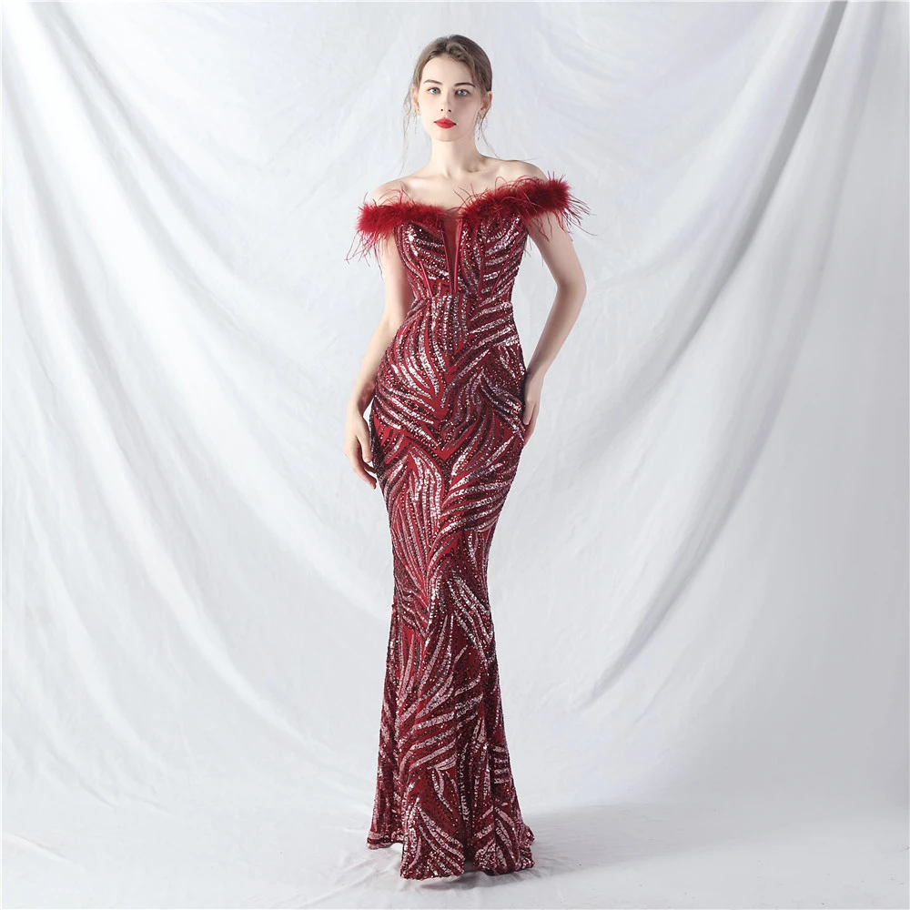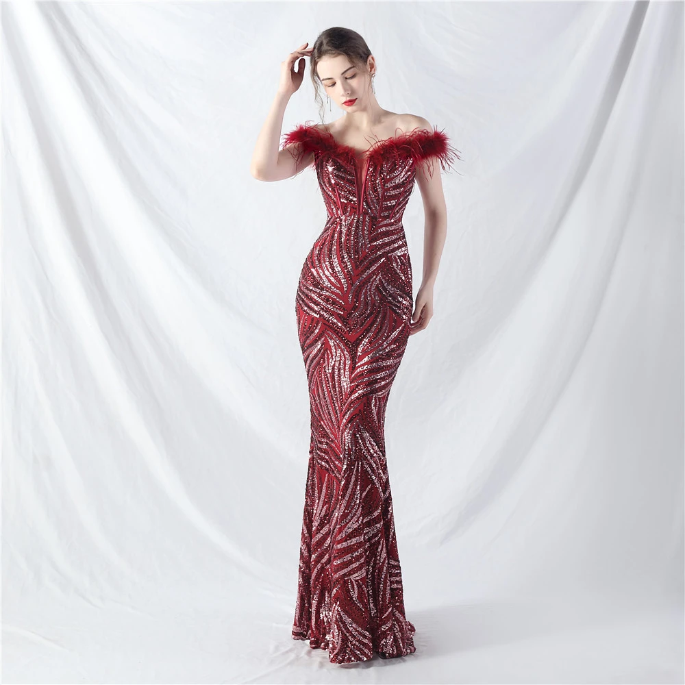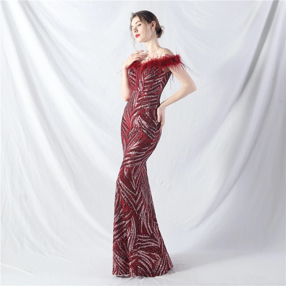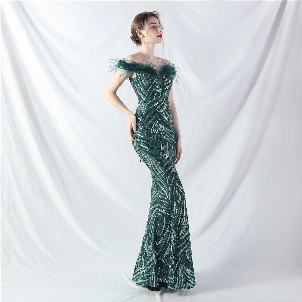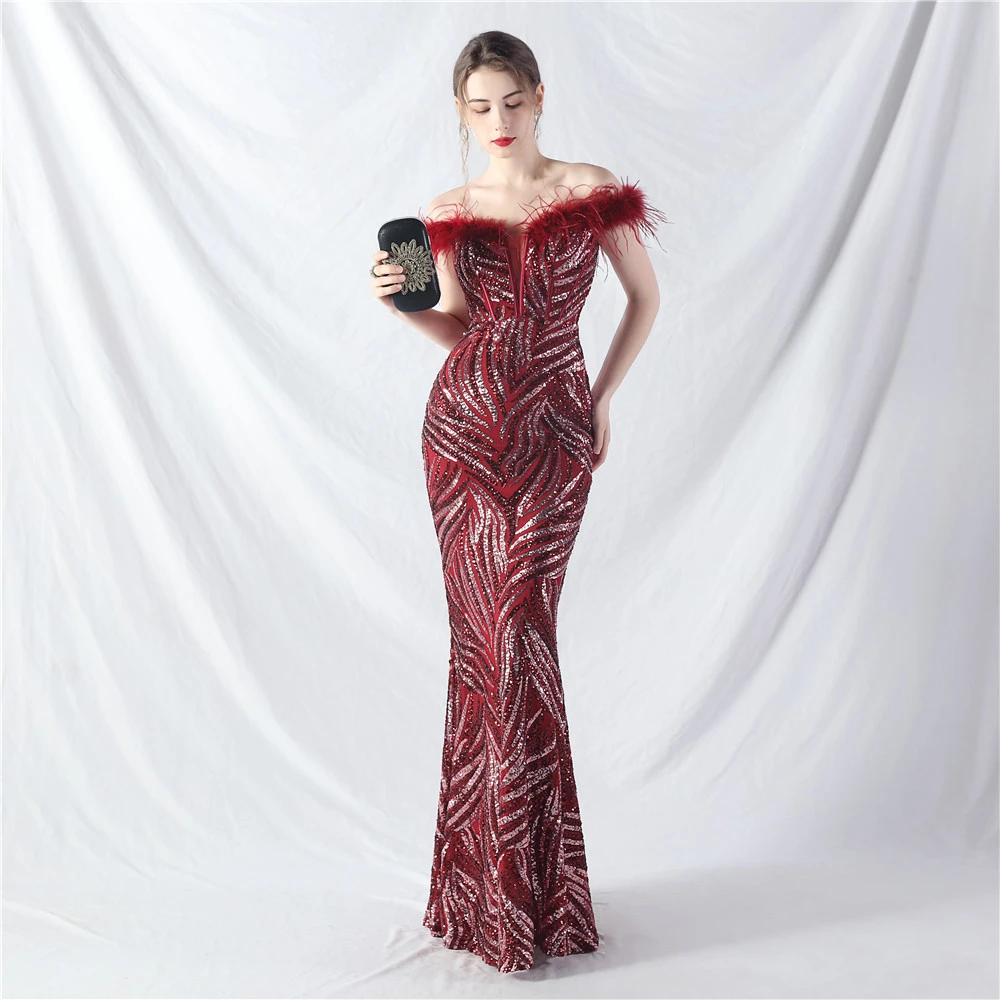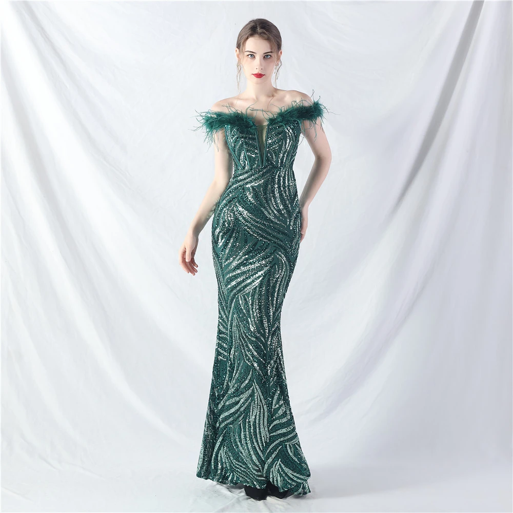 Palace Fishbone Waisted Vest Crafted Ostrich Feather High-End Sequin Evening Dress
