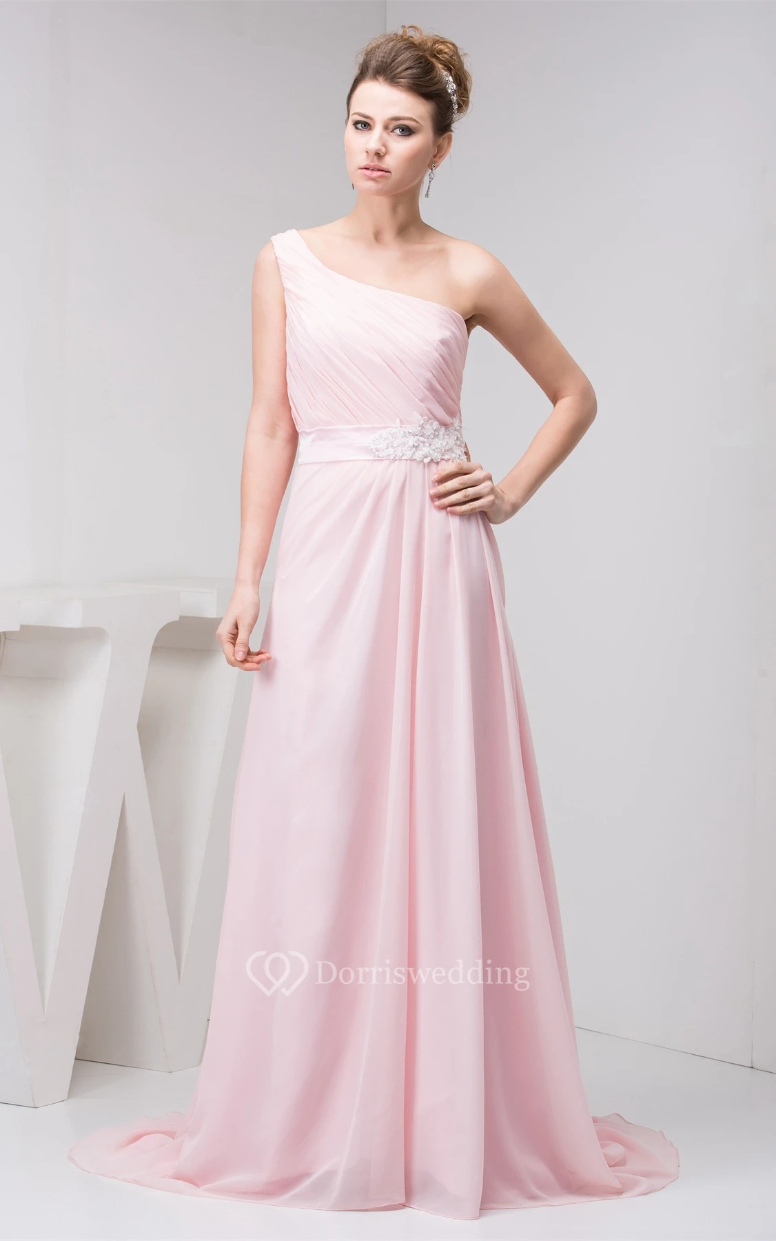Pastel Chiffon One-Shoulder Appliques and Gown With Ruching