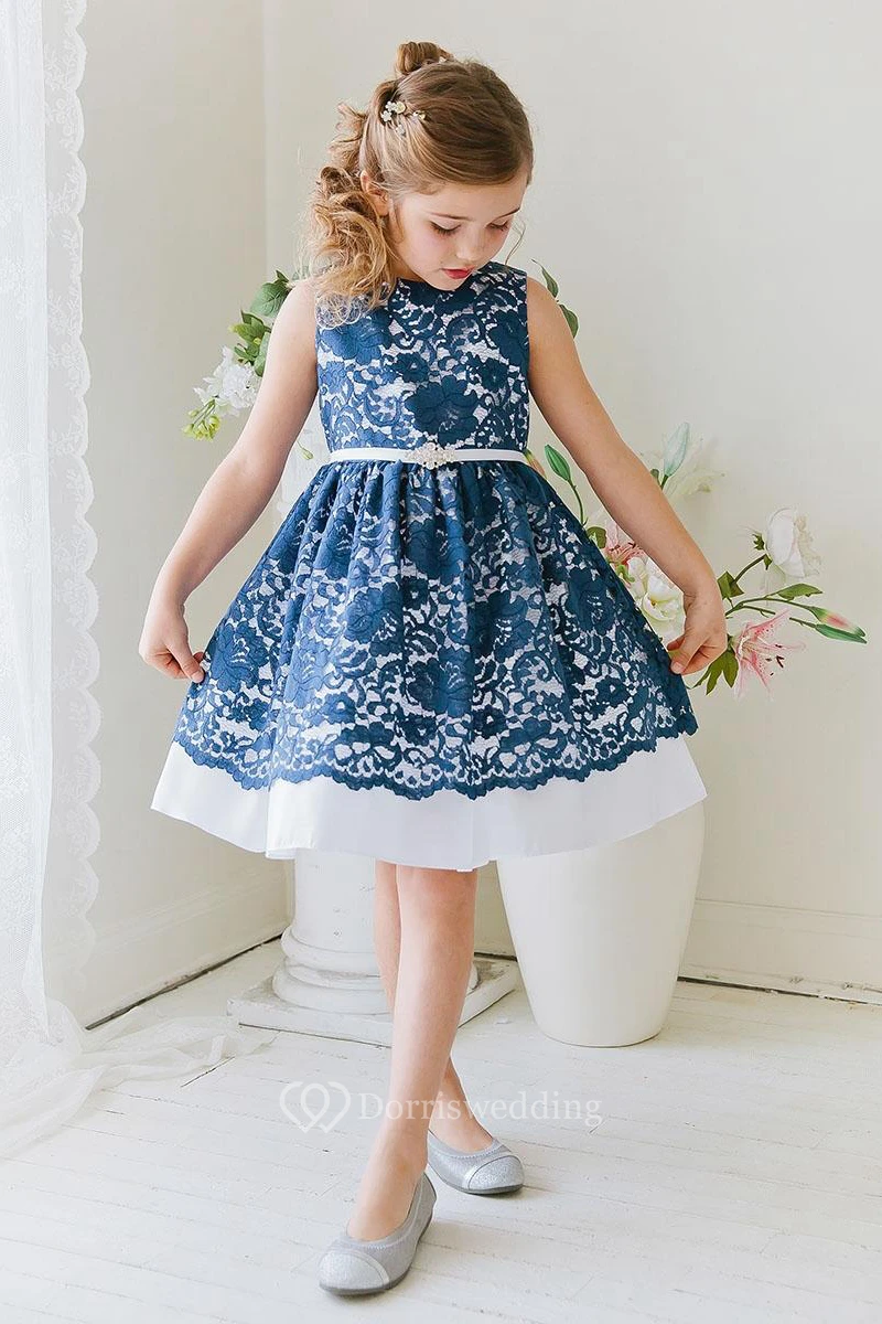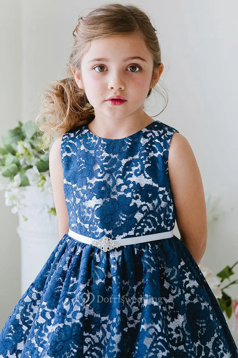 Tea-Length Beaded Floral Lace&Satin Flower Girl Dress With Ribbon