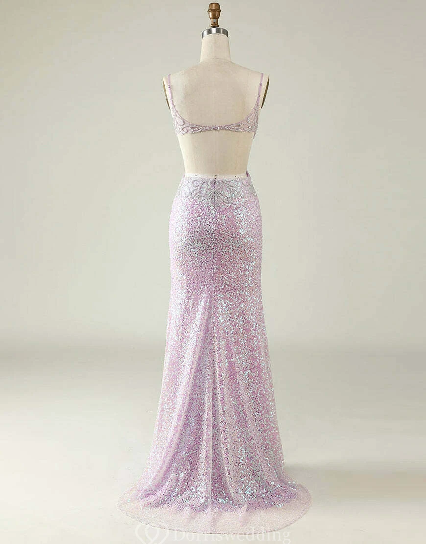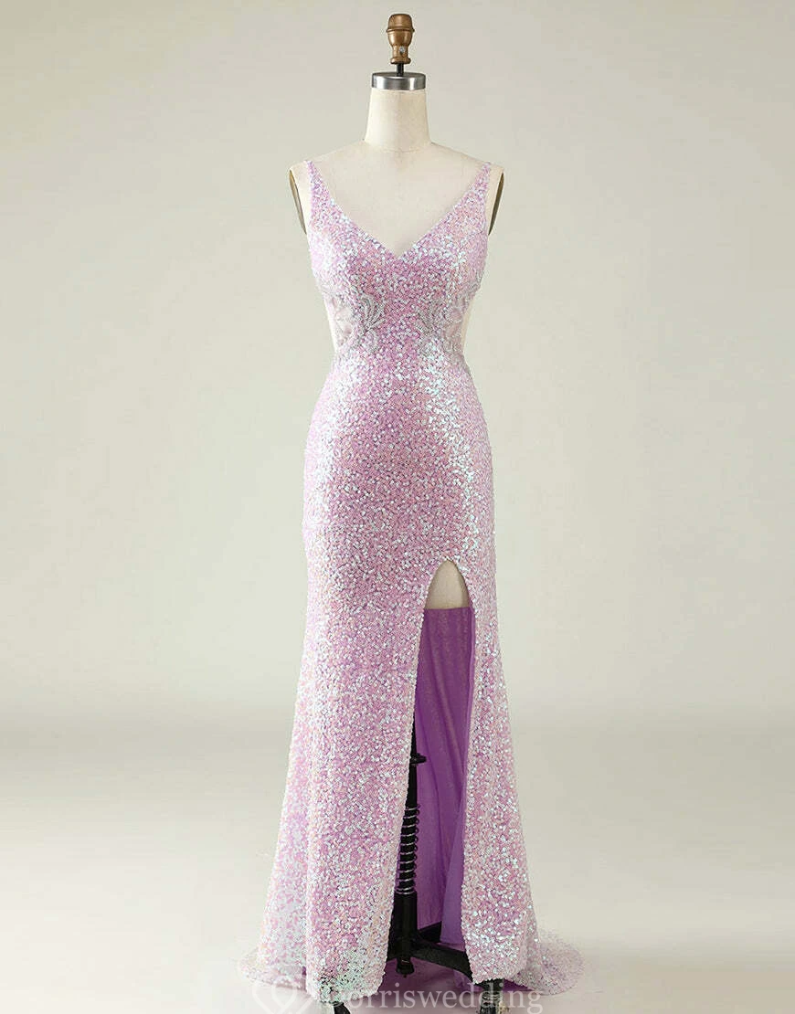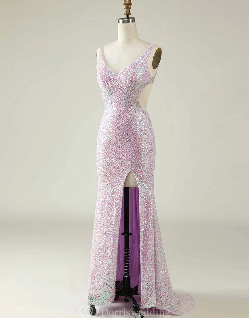 Pastel pink sequin sheath gown with V-neck, delicate straps, side cut-out under bust, thigh‐high slit, and sweep train.