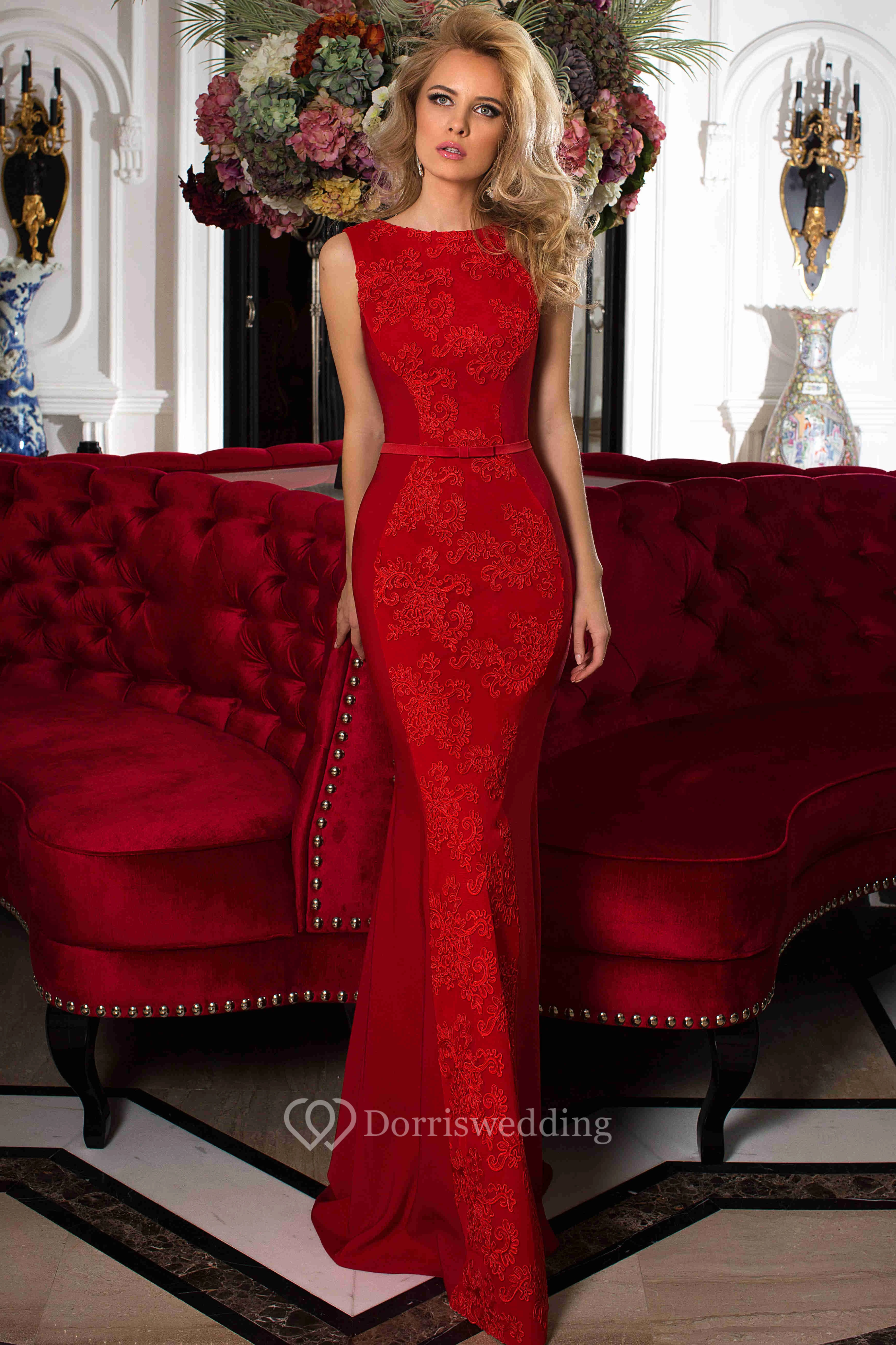 Pencil Appliqued Floor-Length Bateau Sleeveless Lace Prom Dress With Low-V Back