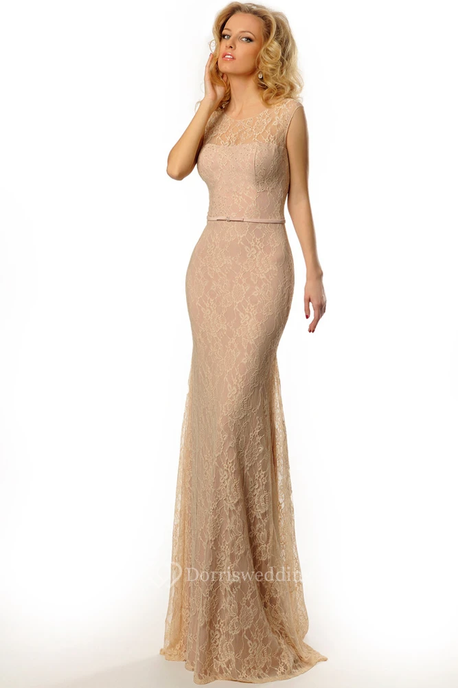 Pencil Appliqued Floor-Length Scoop Sleeveless Lace Prom Dress With Low-V Back And Sweep Train