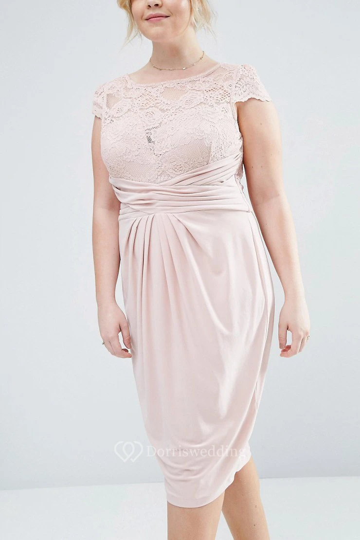 Pencil Cap-Sleeve Scoop-Neck Ruched Knee-Length Chiffon Bridesmaid Dress With Illusion