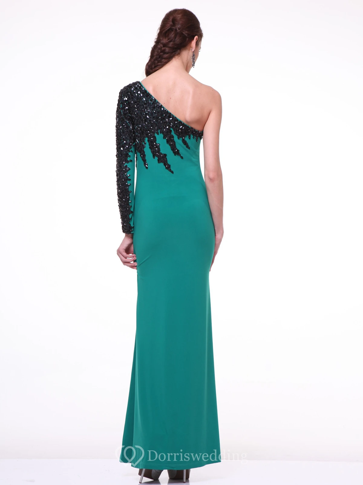 Pencil High-Low One-Shoulder Long Sleeve Jersey Dress With Beading