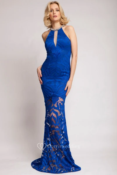 Pencil High Neck Beaded Sleeveless Maxi Lace Prom Dress With Zipper Back And Sweep Train
