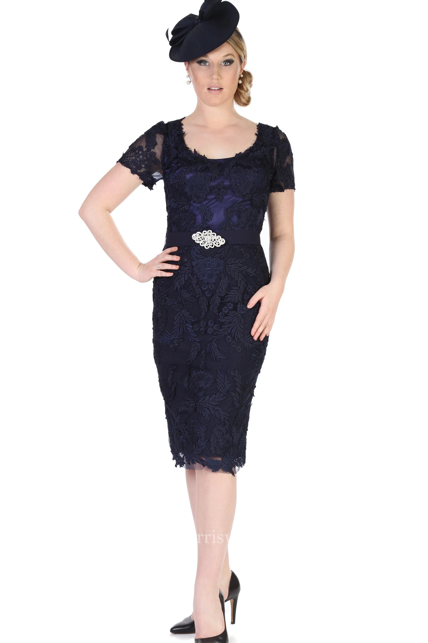 Pencil Knee-Length Scoop Neck Appliqued T-Shirt Sleeve Lace Mother Of The Bride Dress
