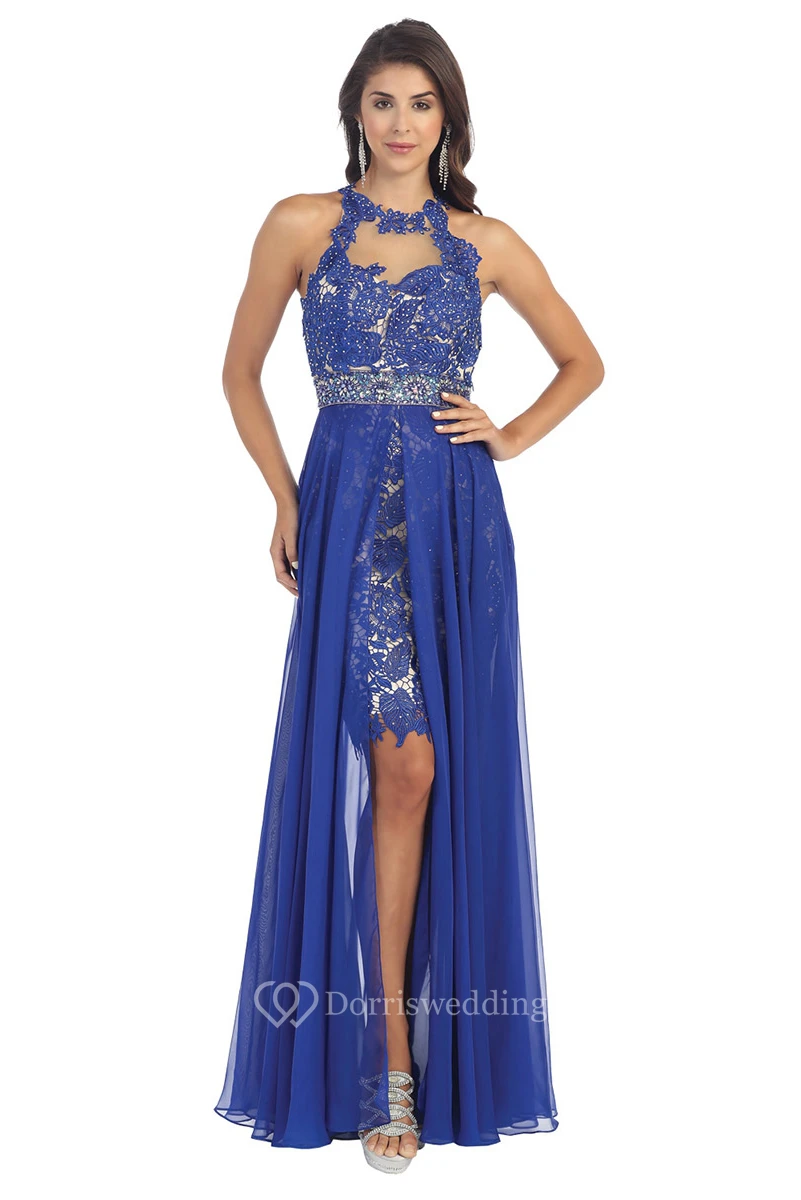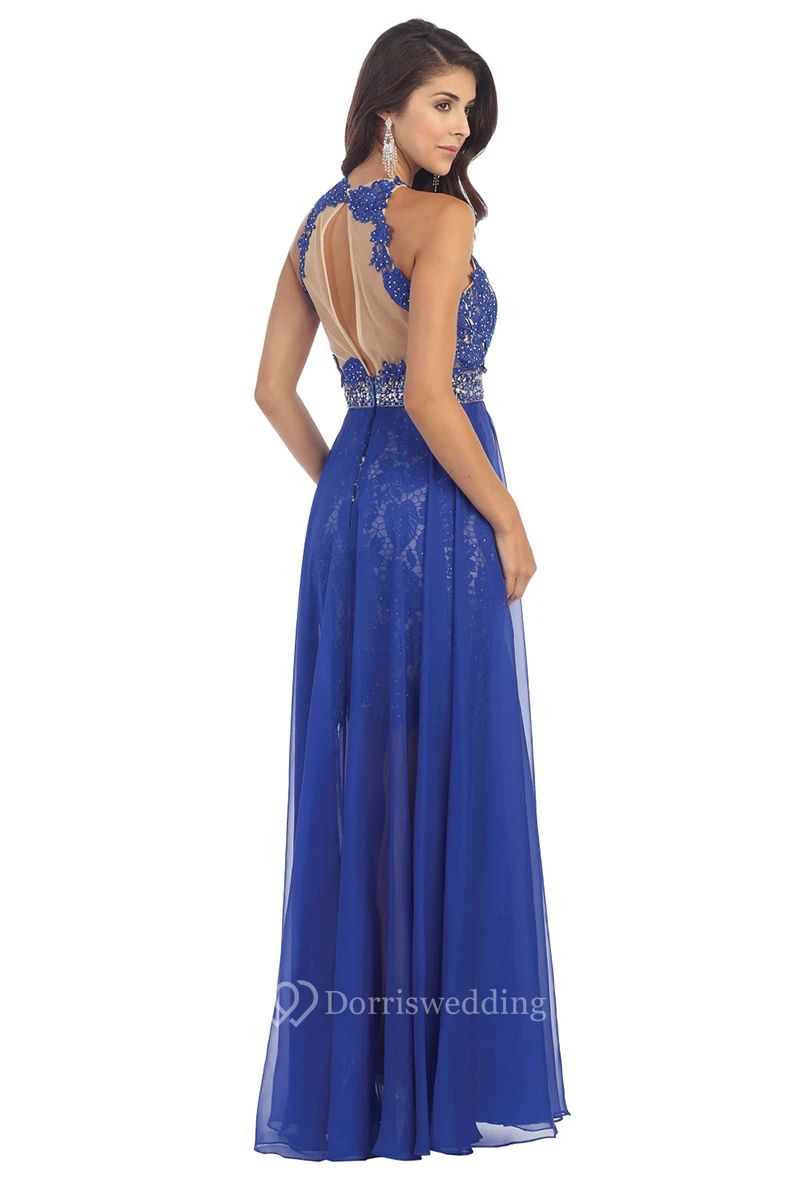 Pencil Long Jewel-Neck Sleeveless Chiffon Illusion Dress With Lace And Pleats