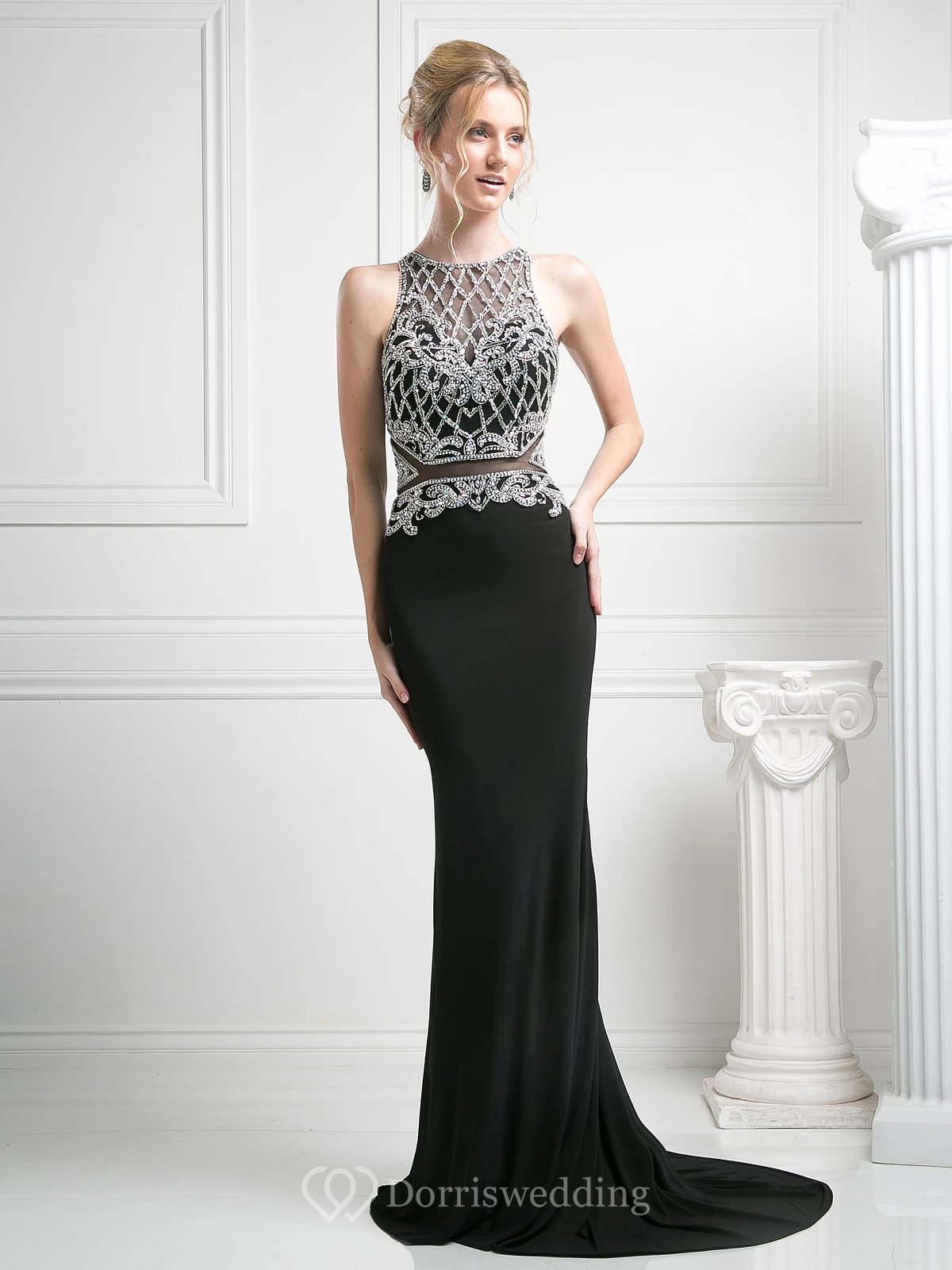 Pencil Long Jewel-Neck Sleeveless Jersey Court Train Keyhole Dress With Beading
