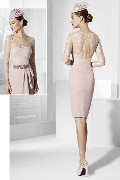 Pencil Long Sleeve Scoop Neck Short Mini Appliqued Jersey Prom Dress With Draping