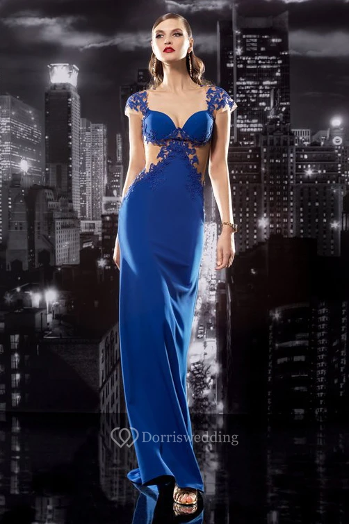 Pencil Maxi Cap-Sleeve Jersey Keyhole Dress With Appliques