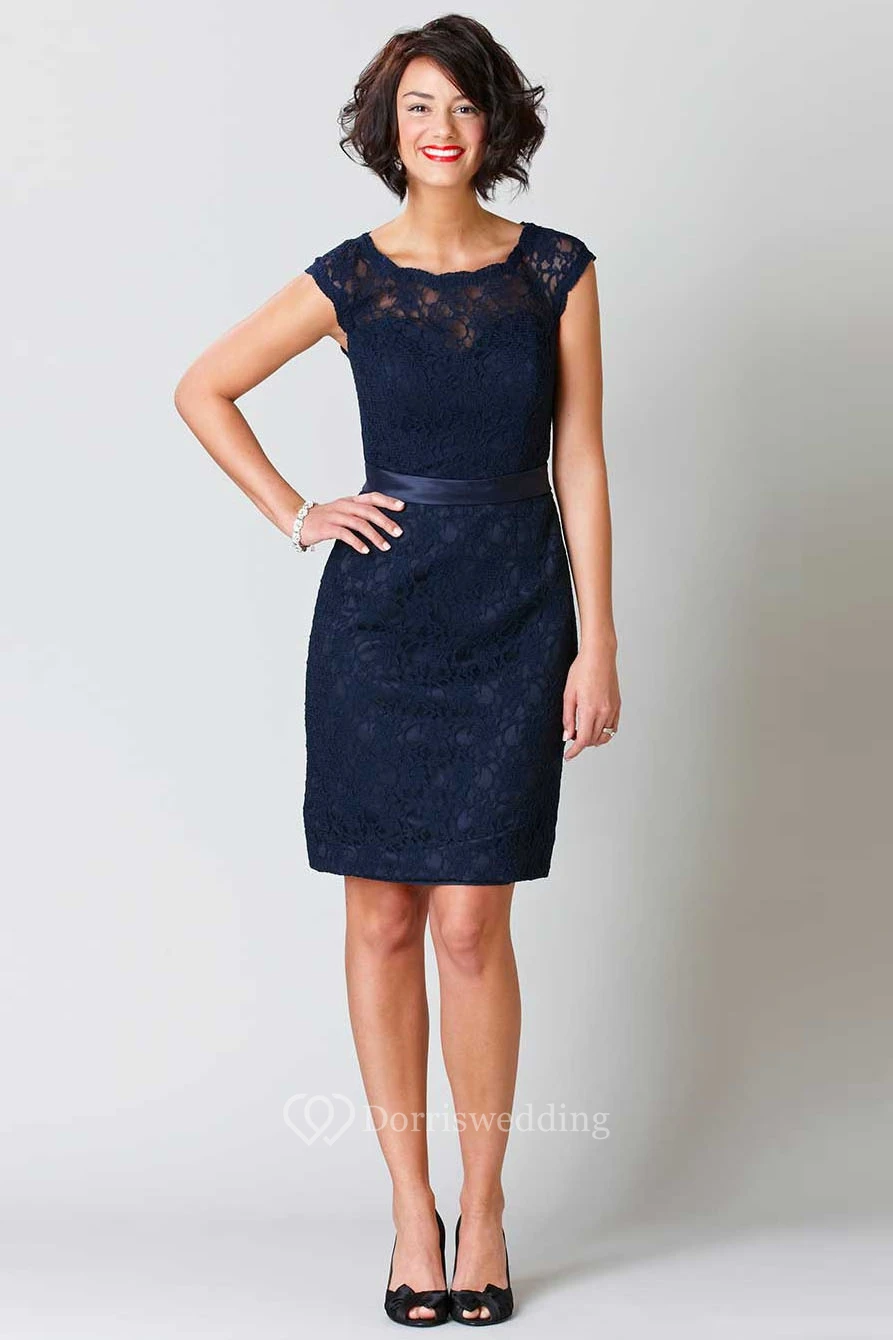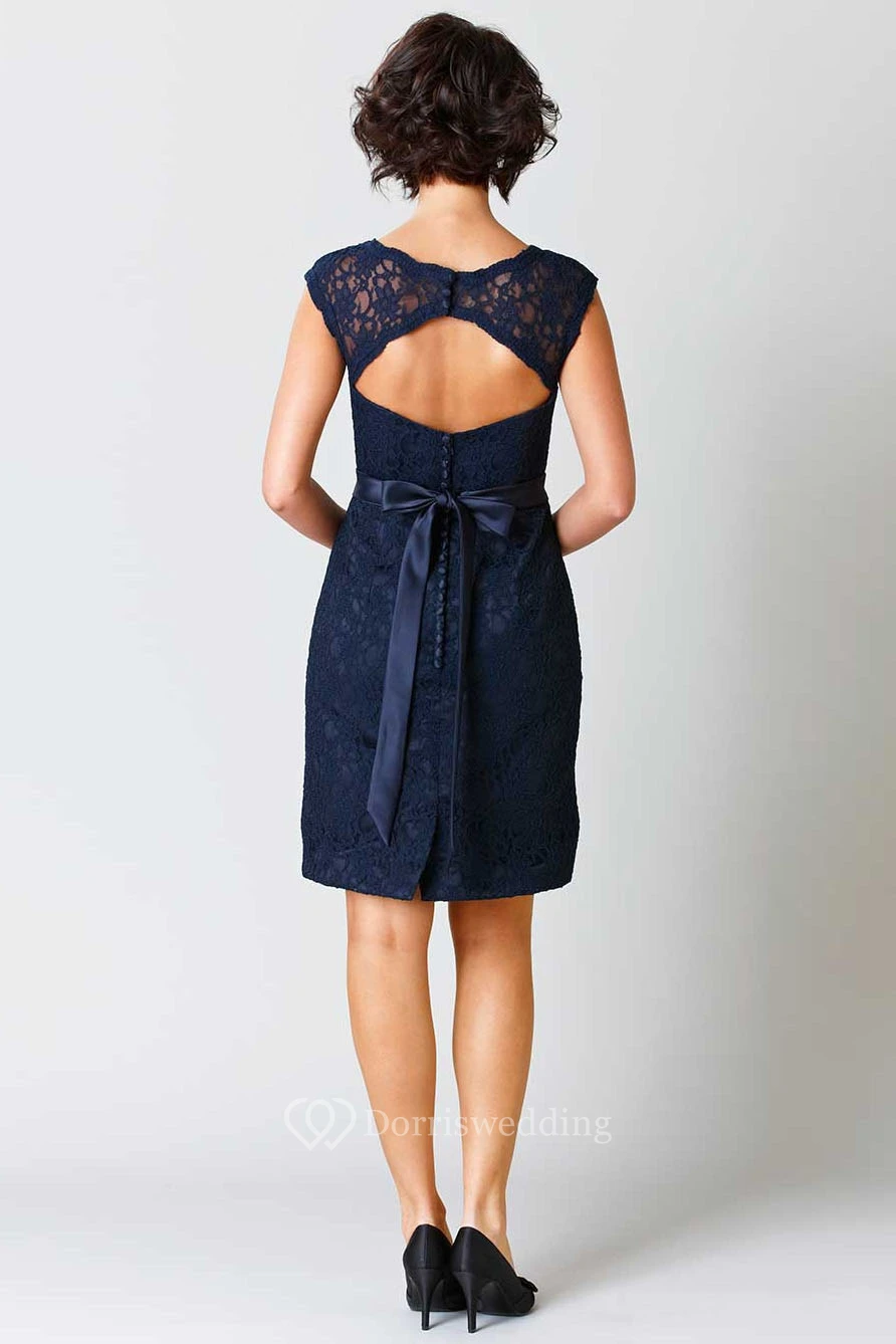 Pencil Sleeveless Short Scoop-Neck Lace Bridesmaid Dress With Ribbon And Keyhole