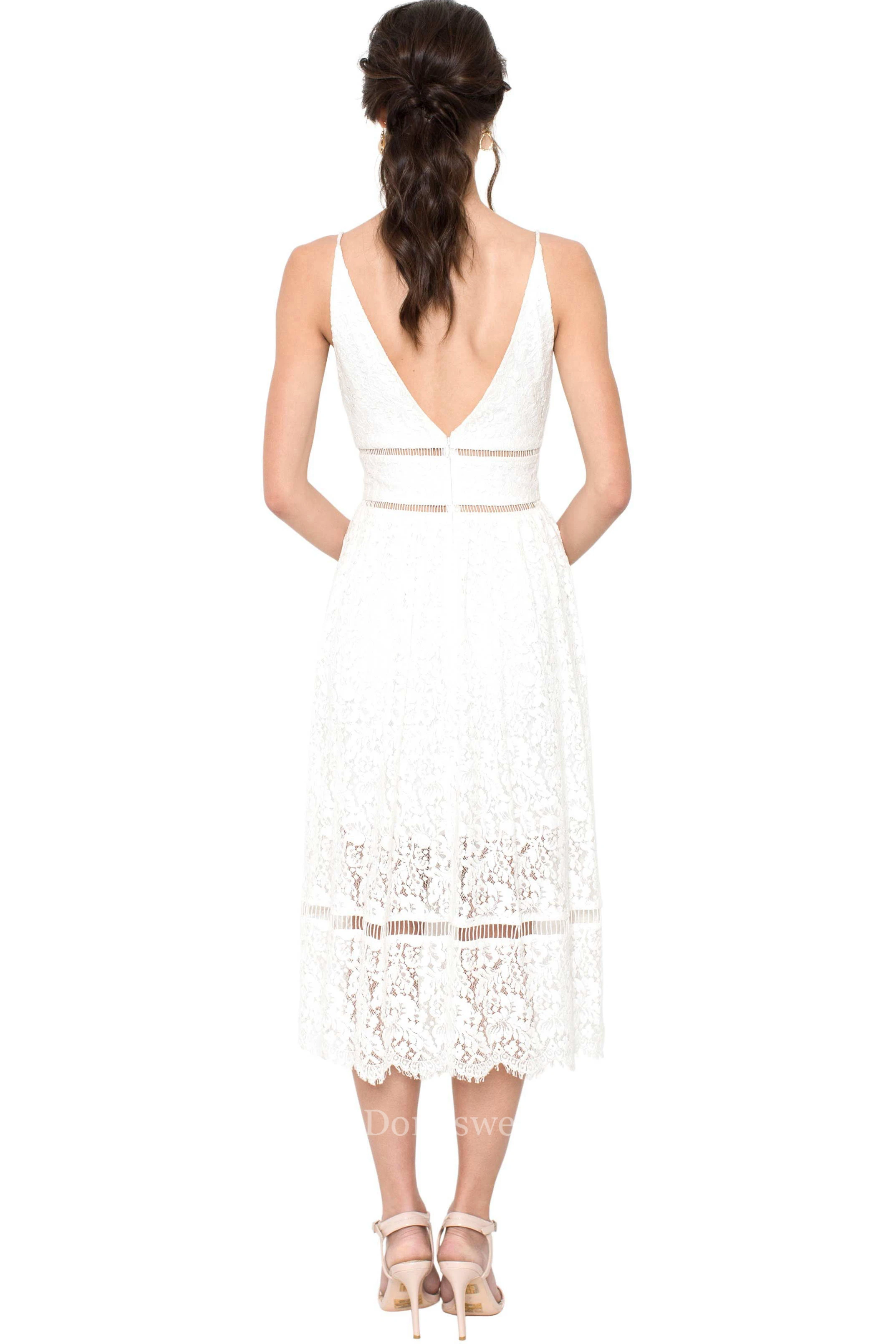 Pencil Tea-Length Spaghetti Sleeveless Lace Little White Dress With Deep-V Back