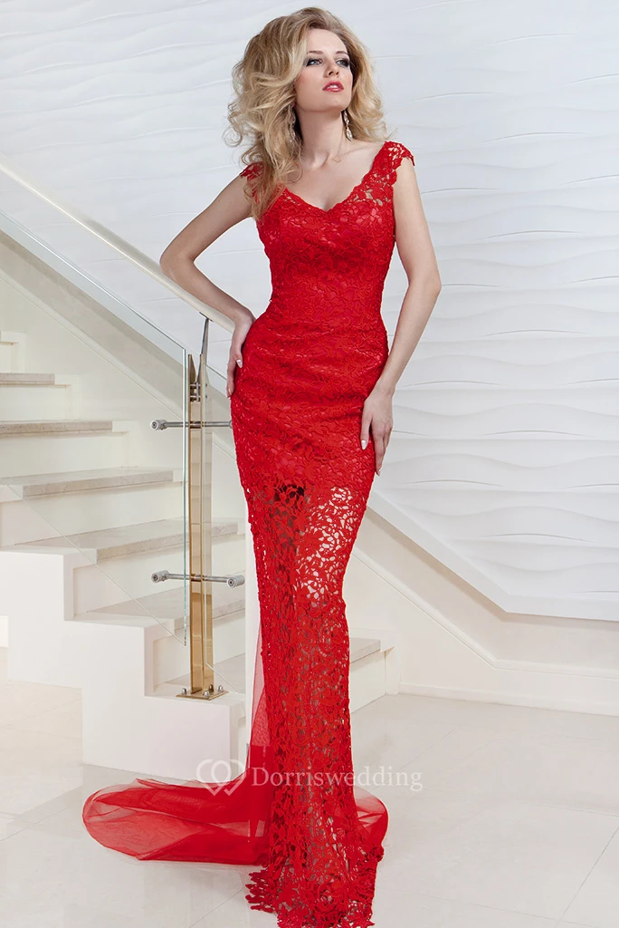 Pencil V-Neck Cap-Sleeve Floor-Length Lace Prom Dress With Keyhole Back And Watteau Train