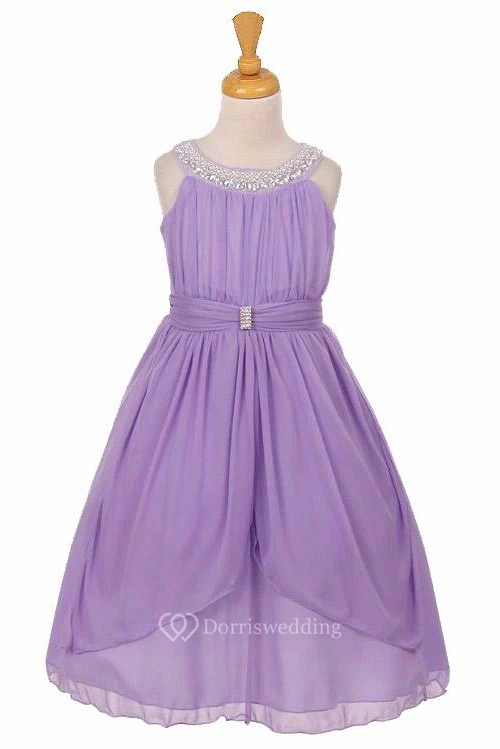 Peplum Tea-Length Tiered Pleated Chiffon&Tulle Flower Girl Dress With Ribbon
