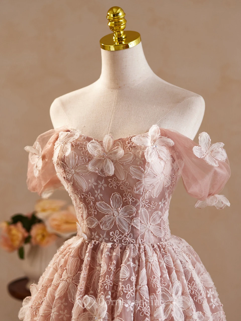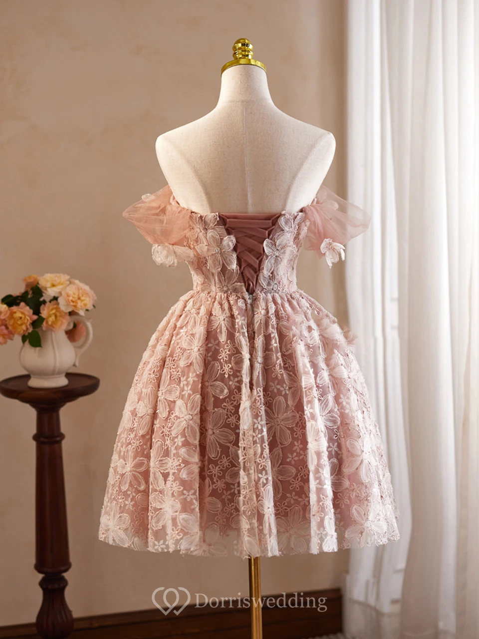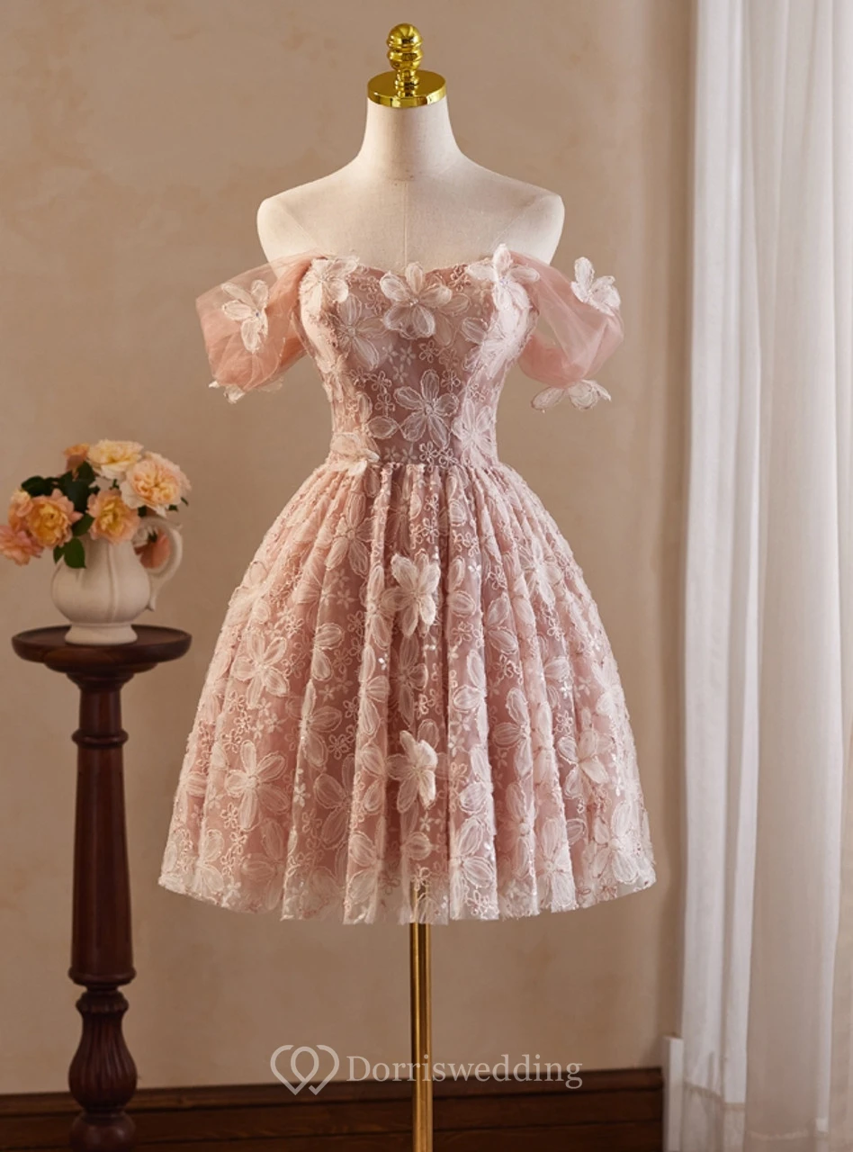 This elegant pink dress features off-the-shoulder sleeves with flower appliqués and a knee-length skirt with white lace detailing. The design is sweet and sophisticated, perfect for boutique displays or special events. The lightweight fabric and floral patterns create a romantic vibe, ideal for parties or weddings. The mannequin presentation highlights its charm and versatility.