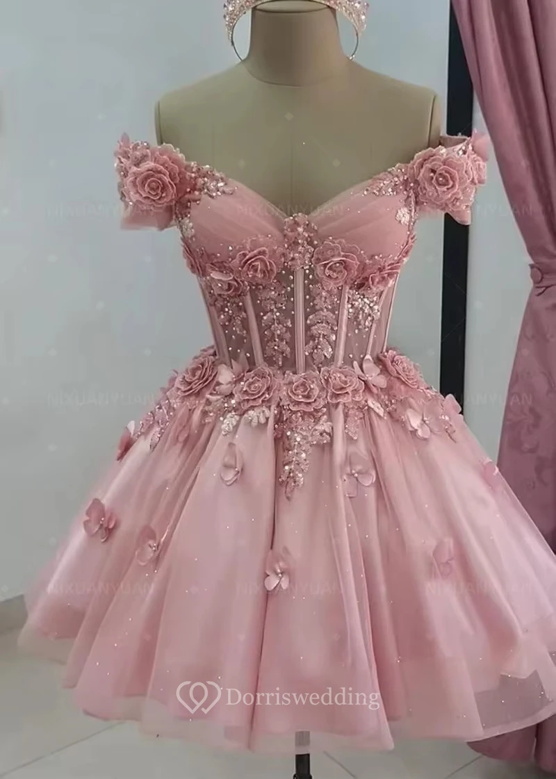 This sweet pink off-the-shoulder dress features 3D floral appliqués on the bodice and skirt, with a fitted waist and A-line silhouette. The knee-length design is playful and romantic, perfect for garden parties or casual events. The lightweight fabric offers comfort and movement, making it ideal for warm weather occasions.