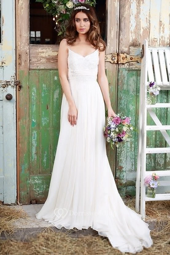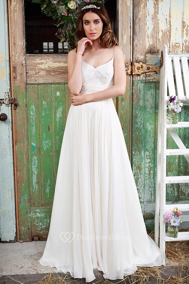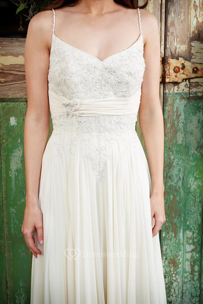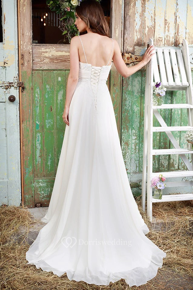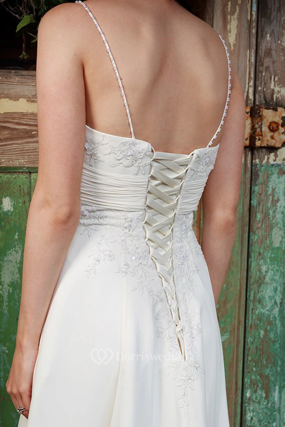 Pleated Spaghetti Long Chiffon Wedding Dress With Appliques And Corset Back