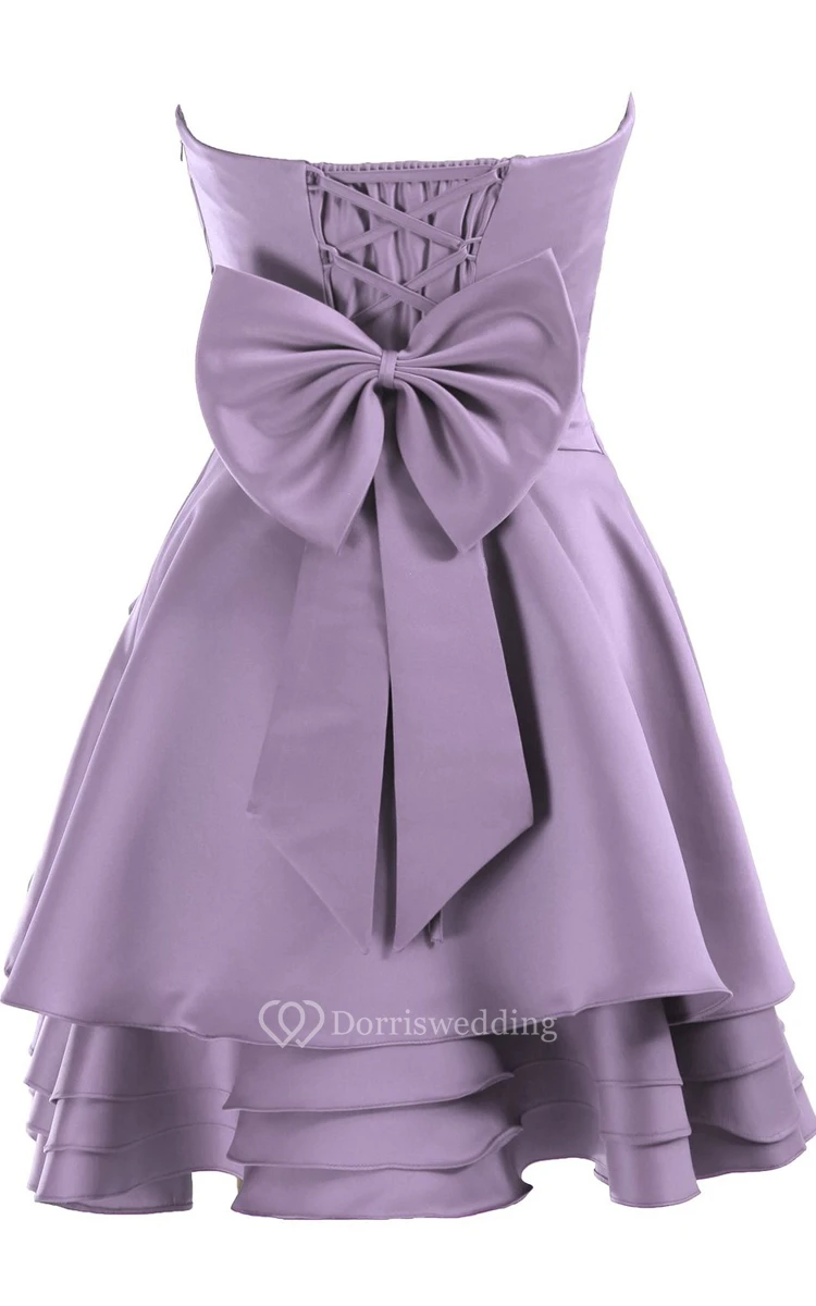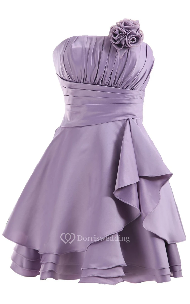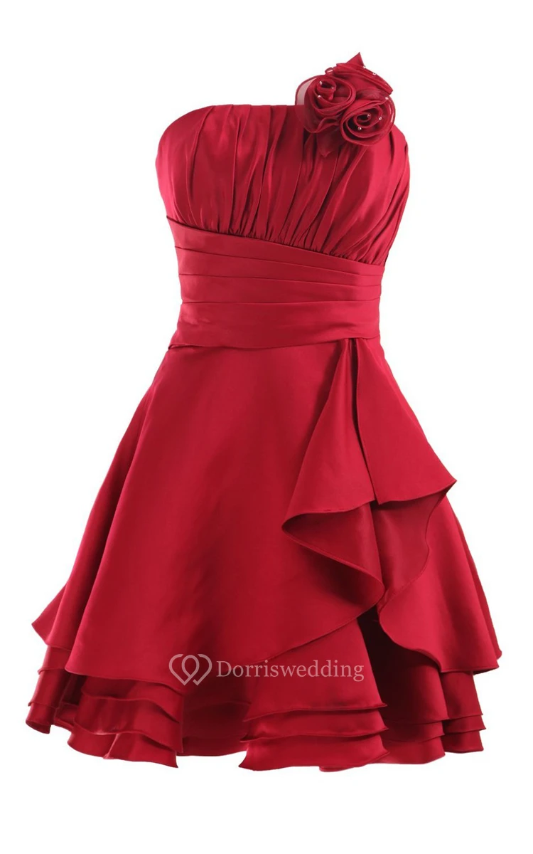 Pleated Strapless DressWith Layered Skirt and Flower