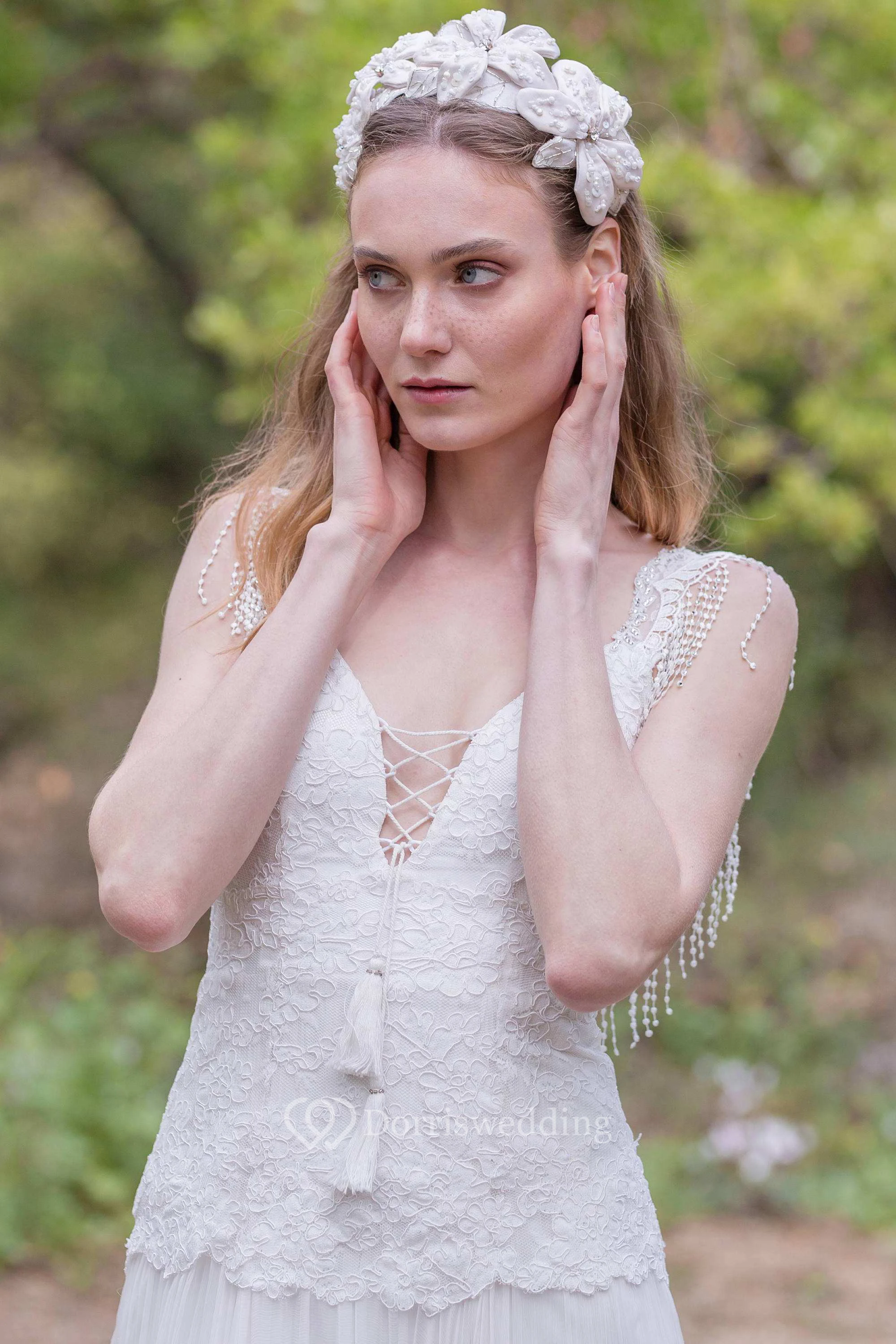 Plunged A-Line Pleated Wedding Dress With Appliques And Beading