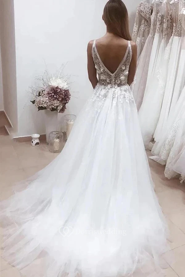 Plunged A-line Tulle Sexy V-neck Elegant Low-v Back Wedding Dress