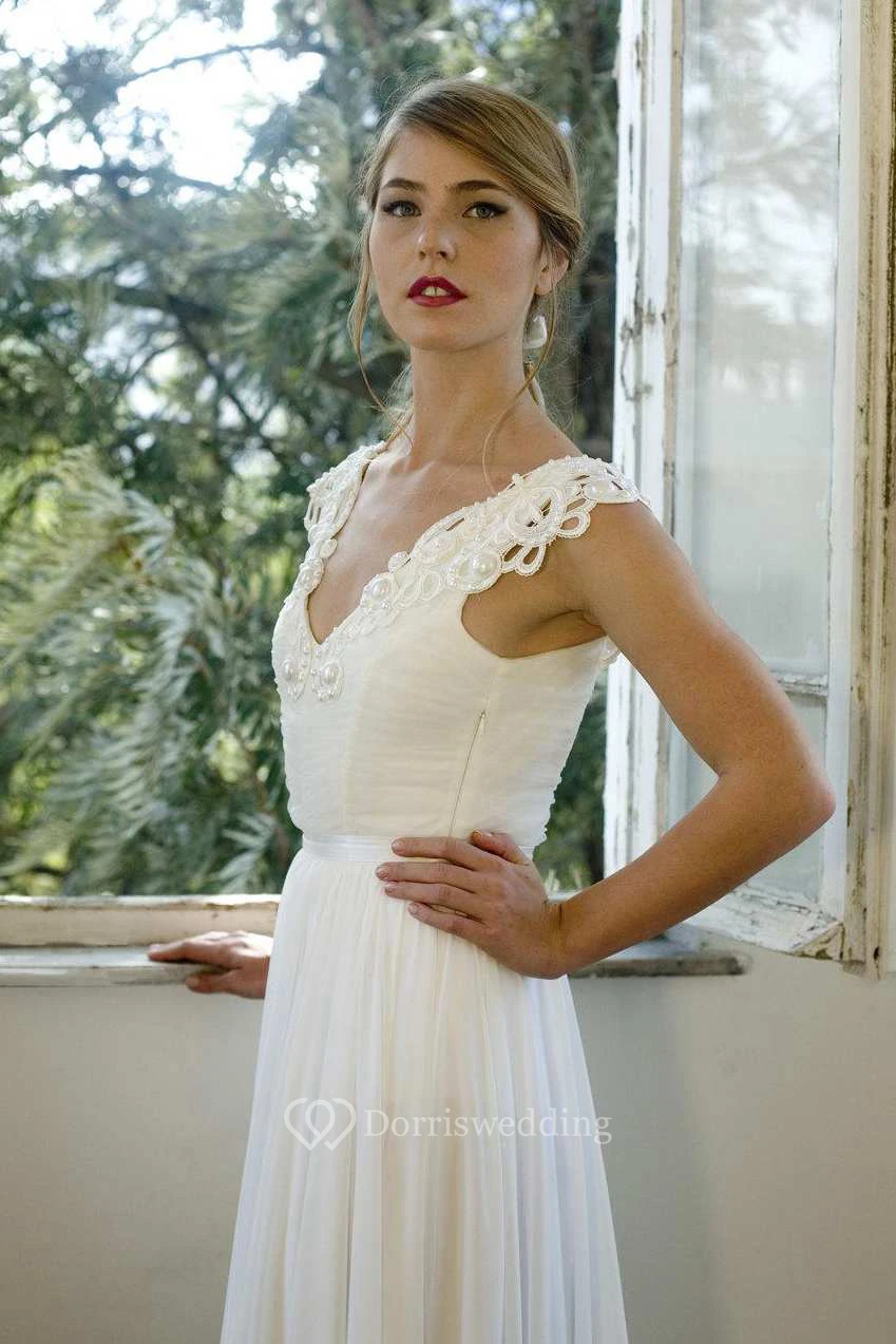 Plunged Appliqued Cap-Sleeve Chiffon Ruched Wedding Backless Dress
